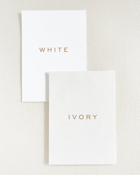 White or IvoryWhite is a true bright white, while ivory is a soft white. Ivory is not a yellow toned paper. Both hold ink color extremely well, and your envelopes will match your paper color.