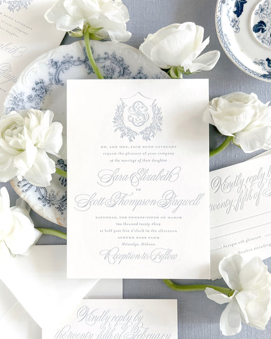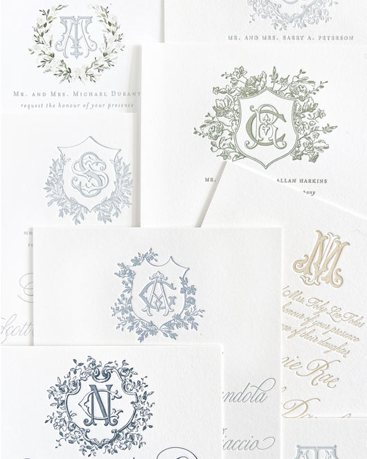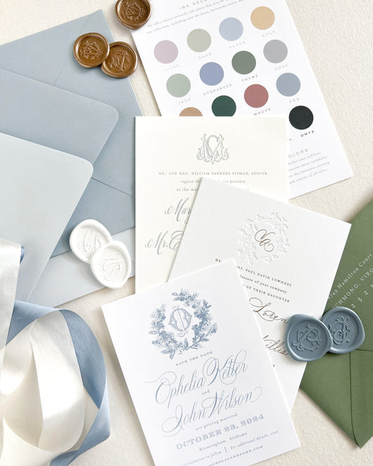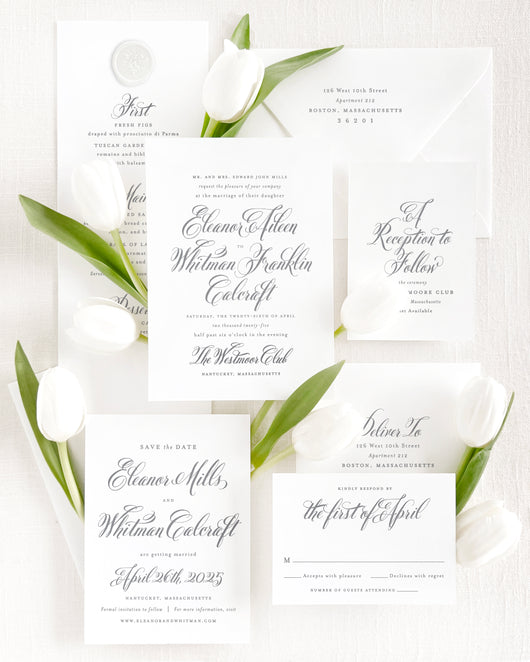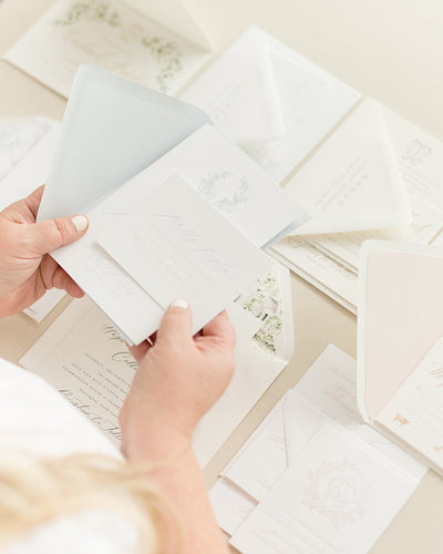Our curated collection of diverse suites are designed to set the tone for a range of wedding styles. We invite you to peruse them, and find the one that speaks to your aesthetic and overall feel of your wedding day. You'll notice that each suite includes Save the Dates, Invitation Suites, as well as day-of paper and correspondence.