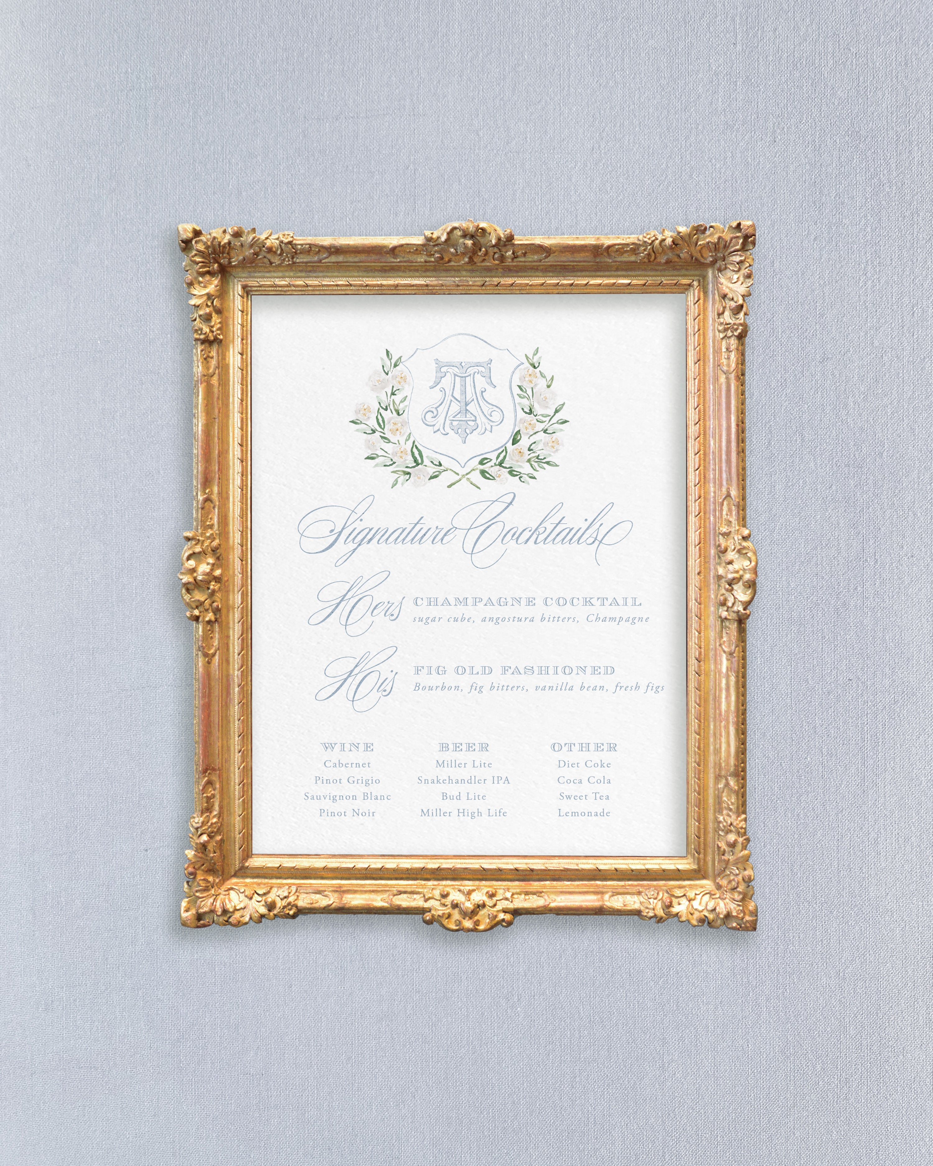 Artistic watercolor meets traditional wedding paper with our Augusta Suite. Pairing classic script letter styling with an optional selection of monogram styles and watercolor floral crests, this suite gives all the versatility while keeping a formal undertone. Augusta is sure to leave a memorable impression for any wedding aesthetic, from afternoon to black-tie.
