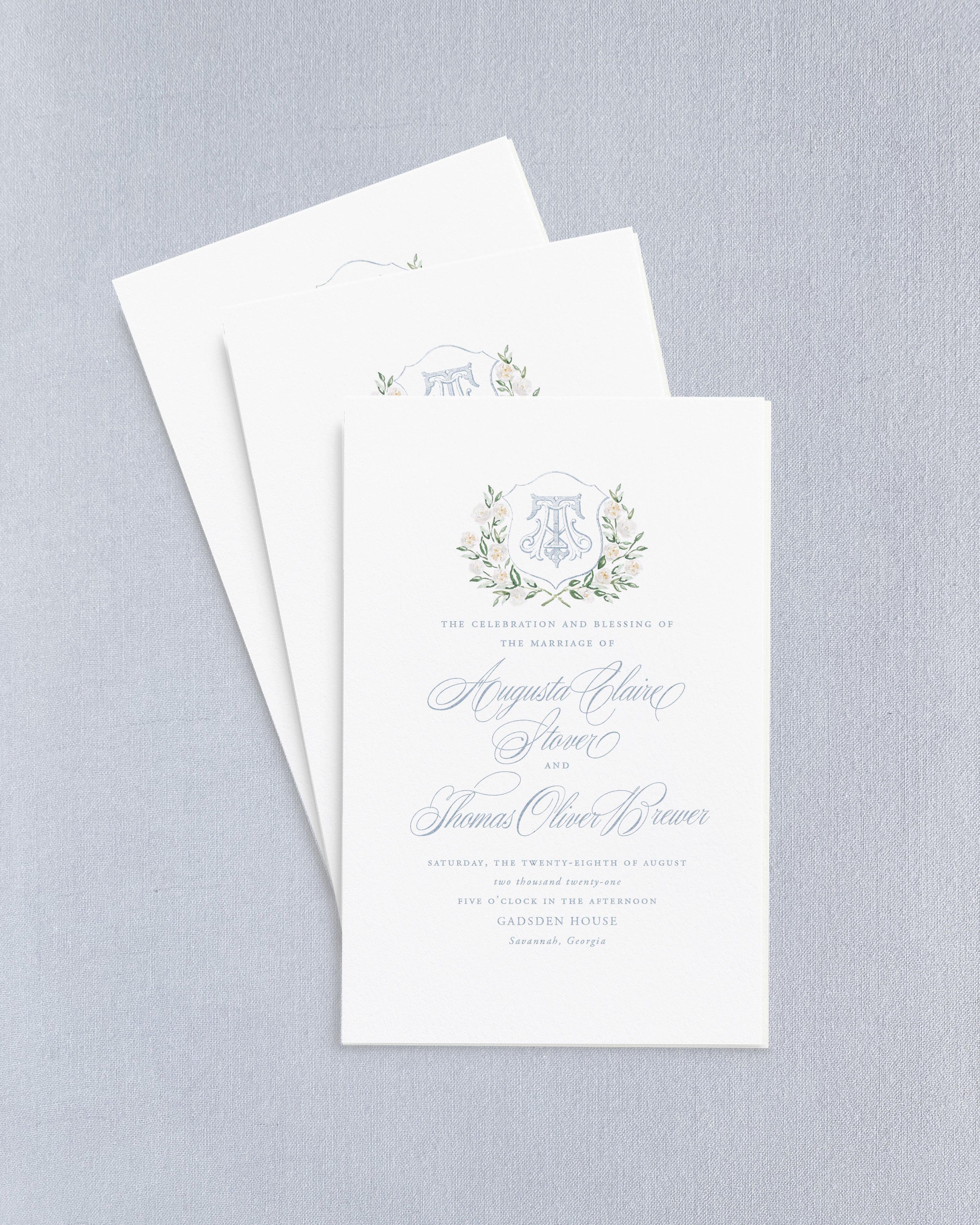 Artistic watercolor meets traditional wedding paper with our Augusta Suite. Pairing classic script letter styling with an optional selection of monogram styles and watercolor floral crests, this suite gives all the versatility while keeping a formal undertone. Augusta is sure to leave a memorable impression for any wedding aesthetic, from afternoon to black-tie.