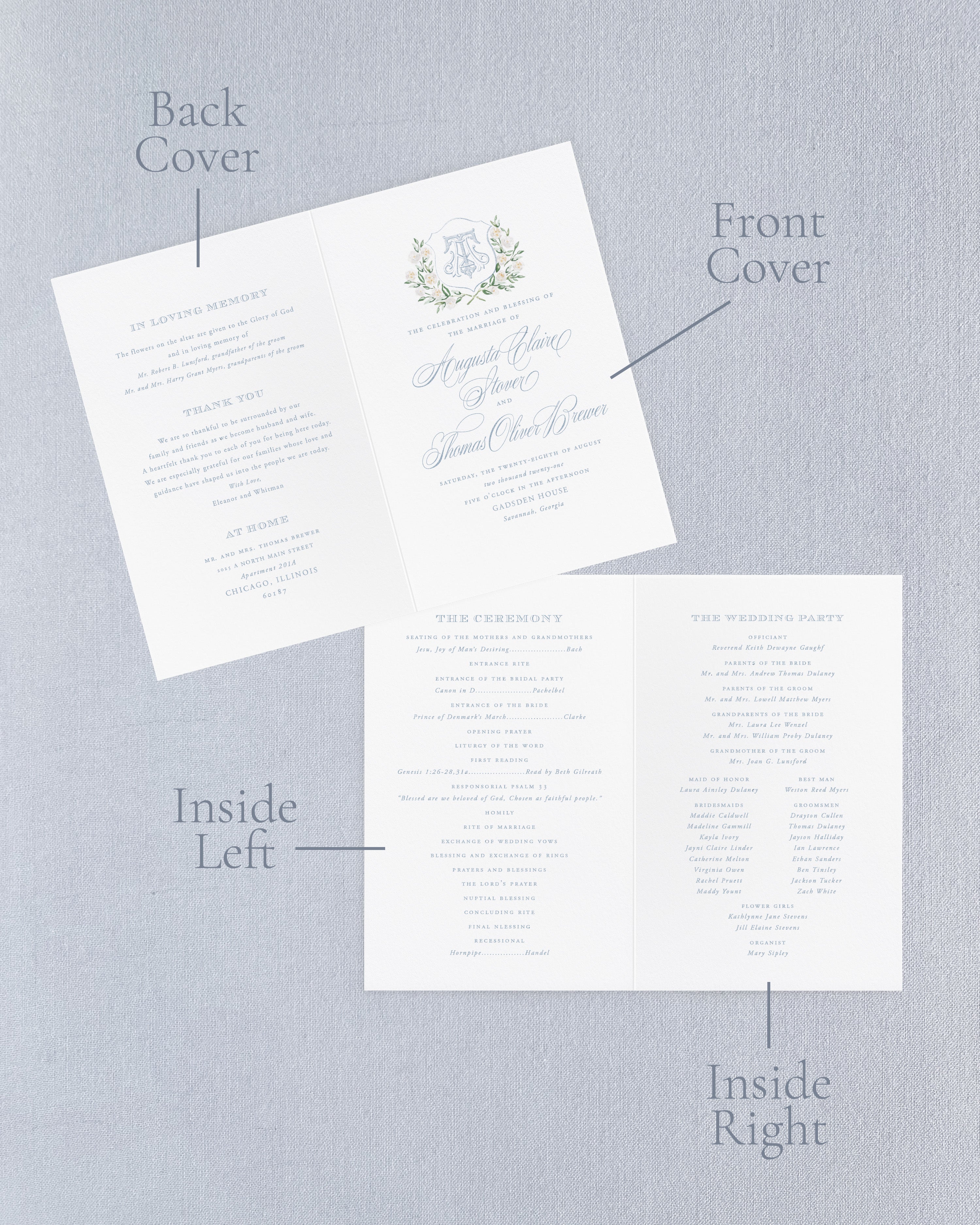 Your day of paper can include a crest or wreath of your choice, as well as a monogram or initials that you will select on the order form.