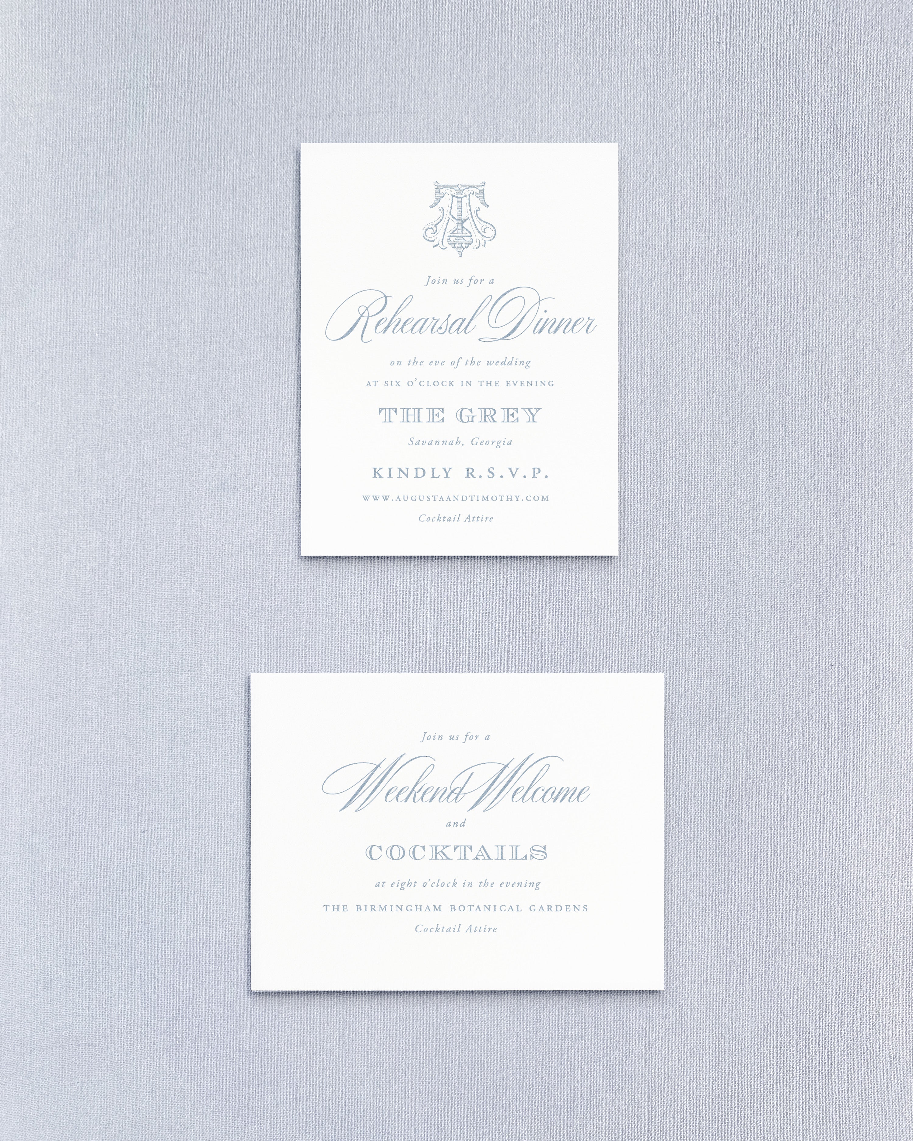 Artistic watercolor meets traditional wedding paper with our Augusta Suite. Pairing classic script letter styling with an optional selection of monogram styles and watercolor floral crests, this suite gives all the versatility while keeping a formal undertone. Augusta is sure to leave a memorable impression for any wedding aesthetic, from afternoon to black-tie.