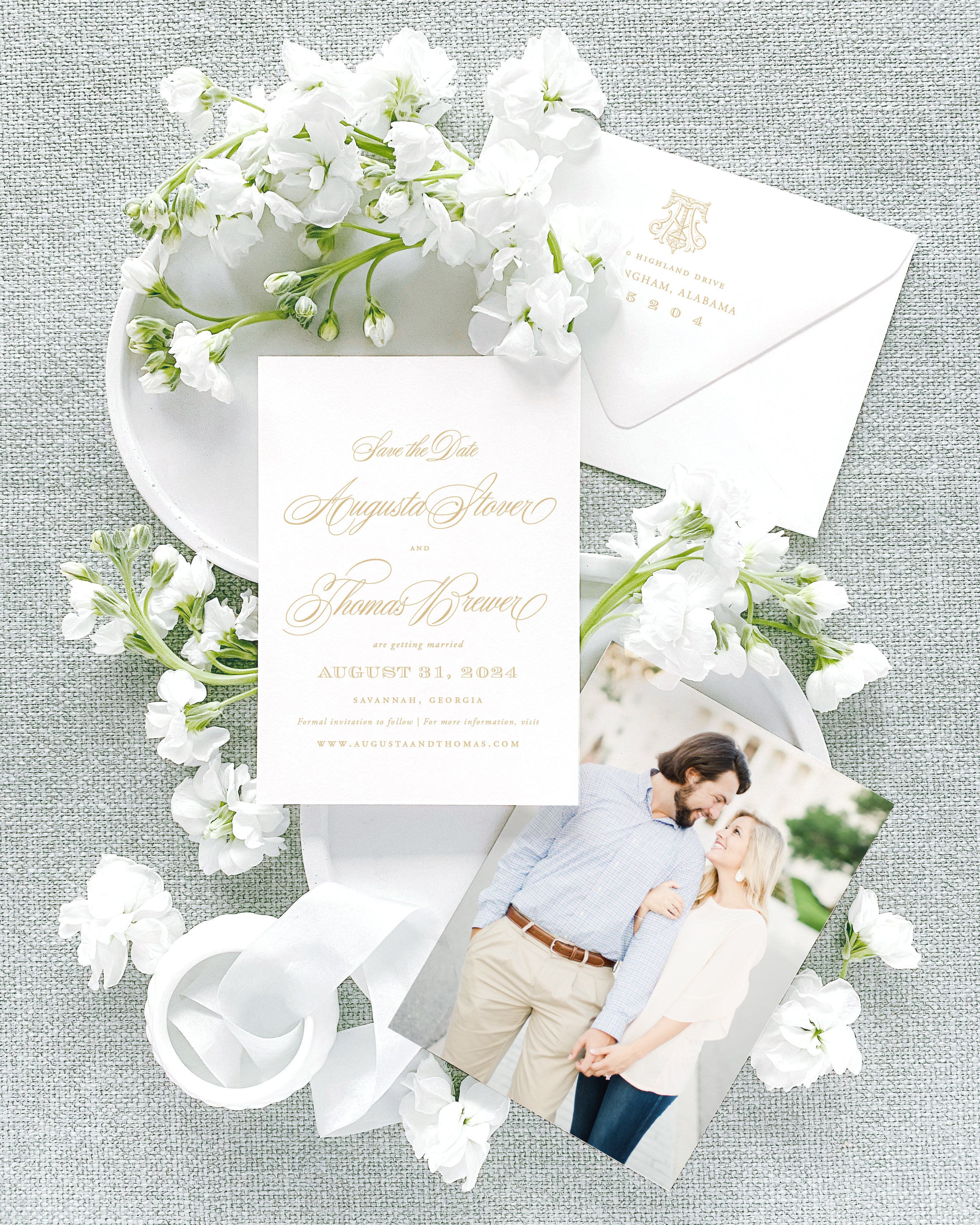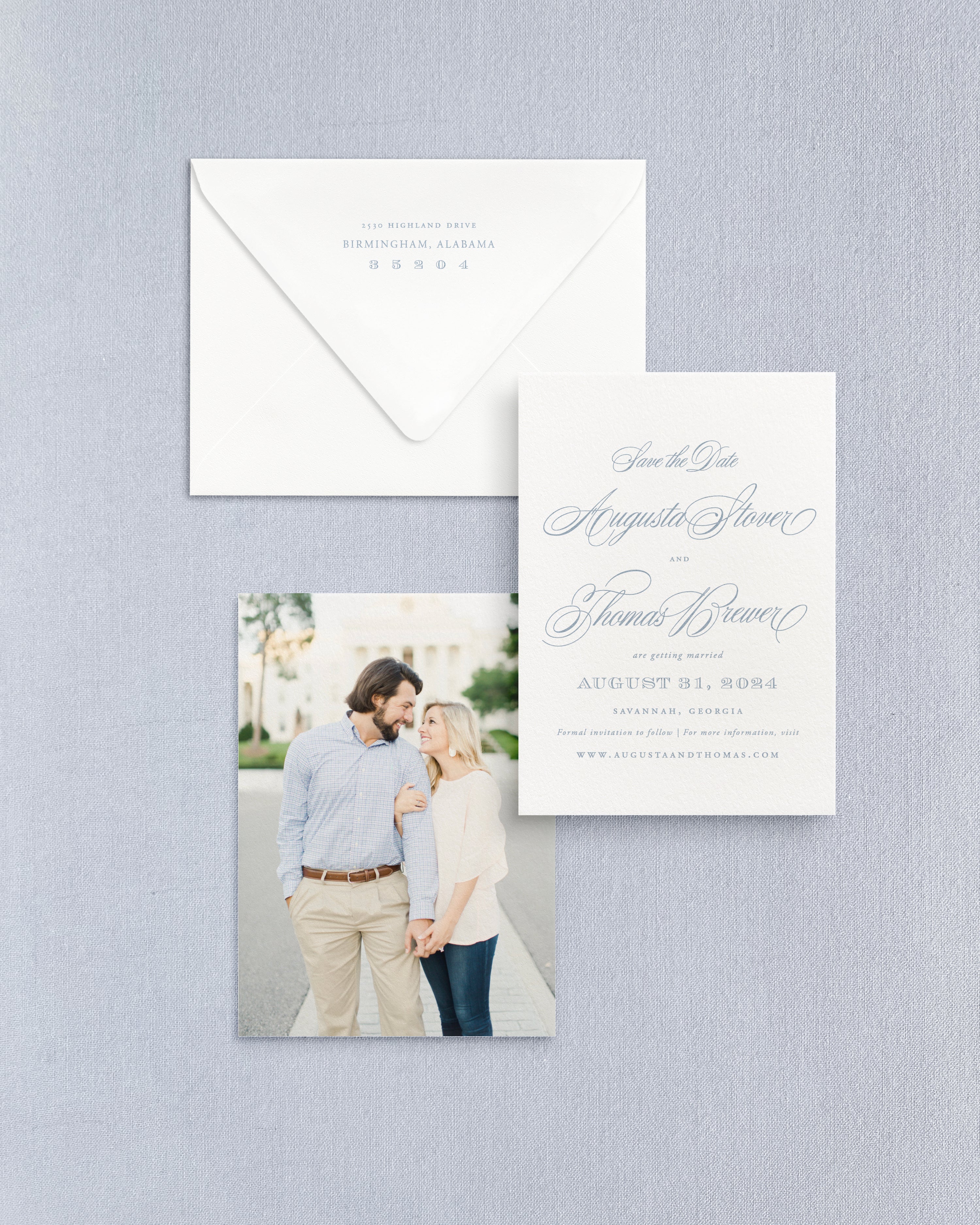 Artistic watercolor meets traditional wedding paper with our Augusta Suite. Pairing classic script letter styling with an optional selection of monogram styles and watercolor floral crests, this suite gives all the versatility while keeping a formal undertone. Augusta is sure to leave a memorable impression for any wedding aesthetic, from afternoon to black-tie.
