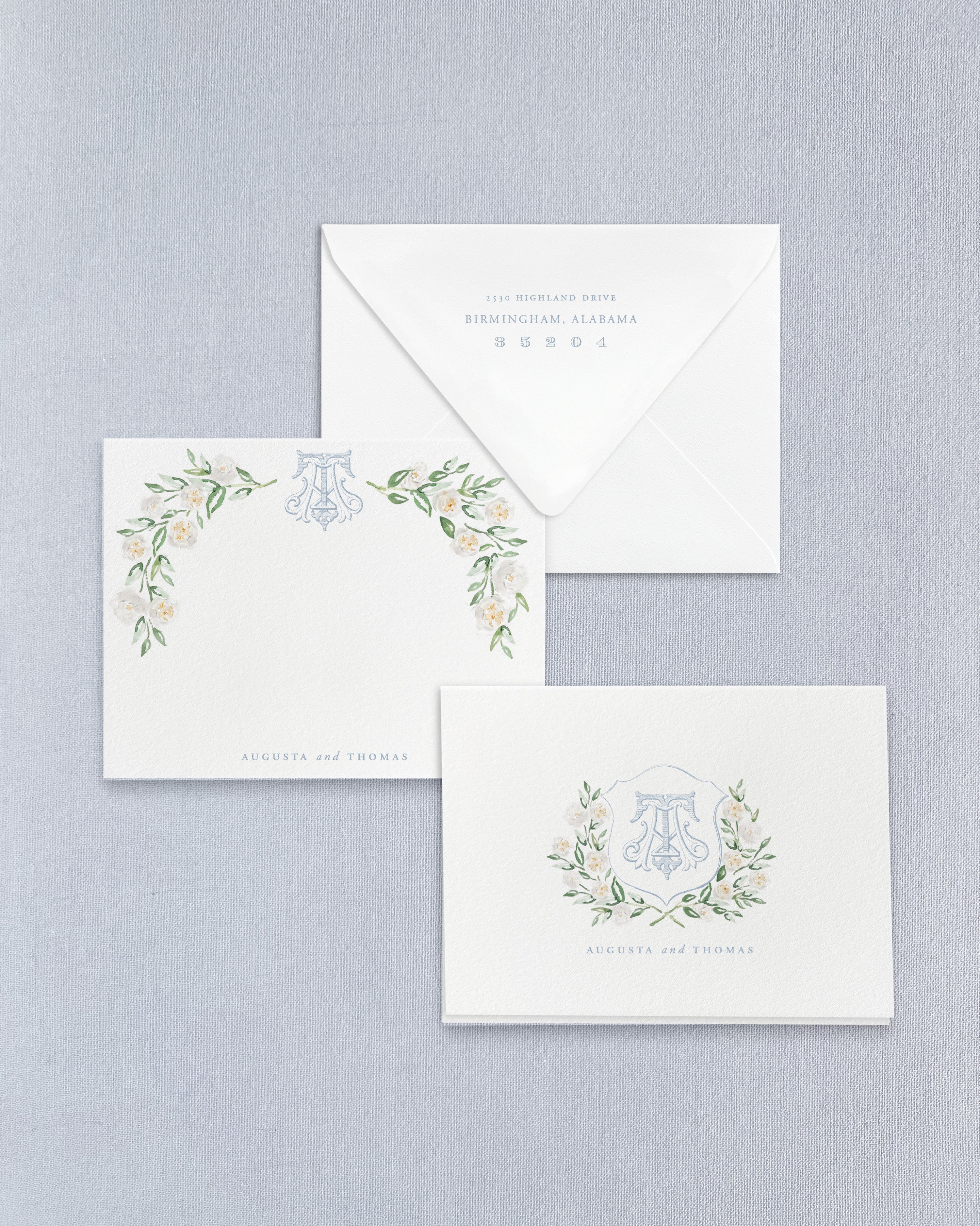Begin post-wedding life right with beautiful notes from the Newlyweds. The Augusta Thank You Cards are even perfect before the wedding, as well as any special occasion. These elegant notes are customized with your selection of ink and paper color, printing method, and design details for an elevated touch of sophistication in your correspondence. Say thank you in style in just a few quick steps!
