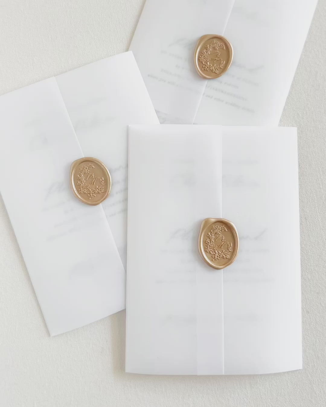 Our personal favorite way to bundle a suite, insert cards, or finish a menu is our vellum cover! Enclose your suite in a luxurious layer of translucent vellum paper, and finish it with a wax seal, ribbon, or both!
