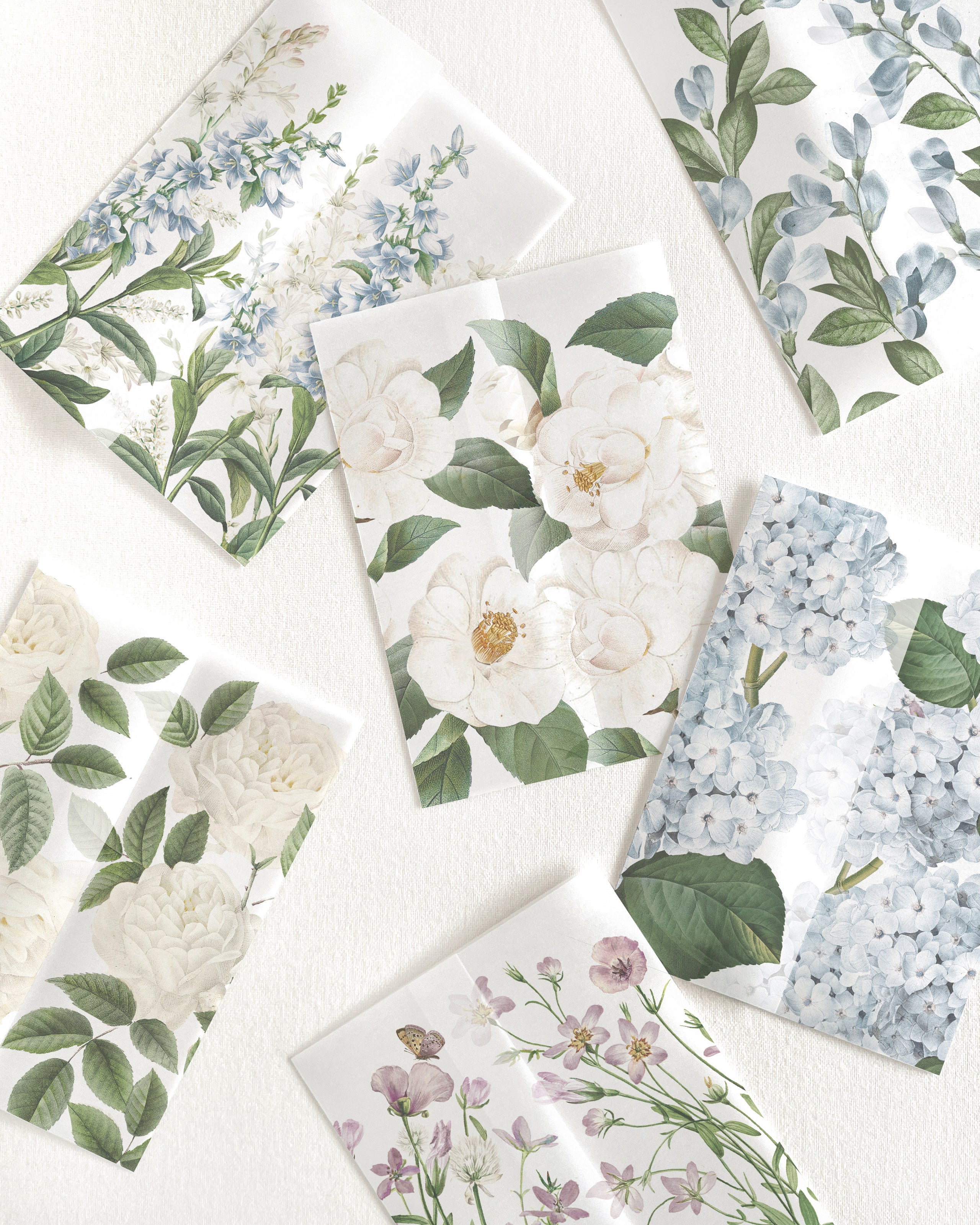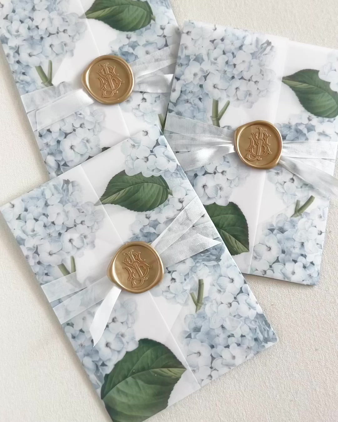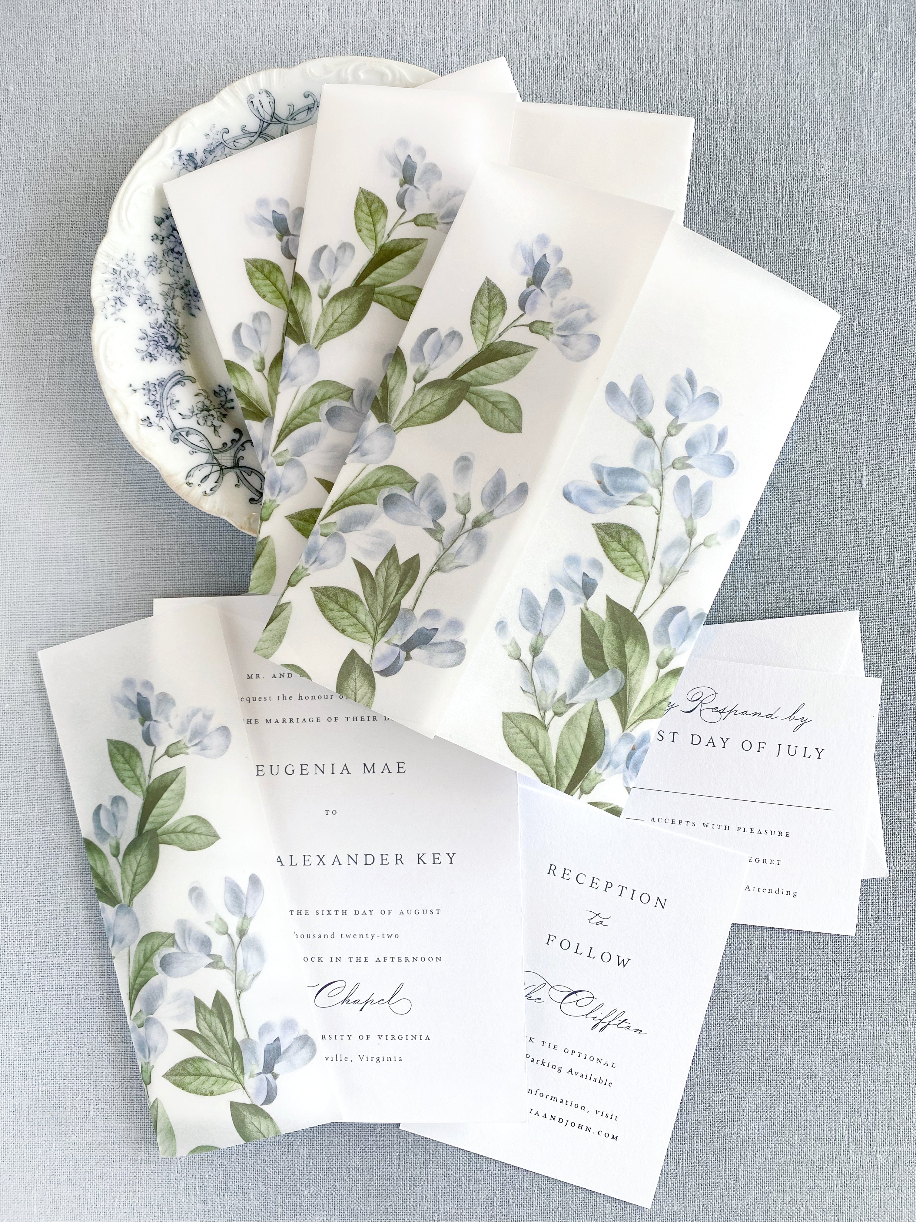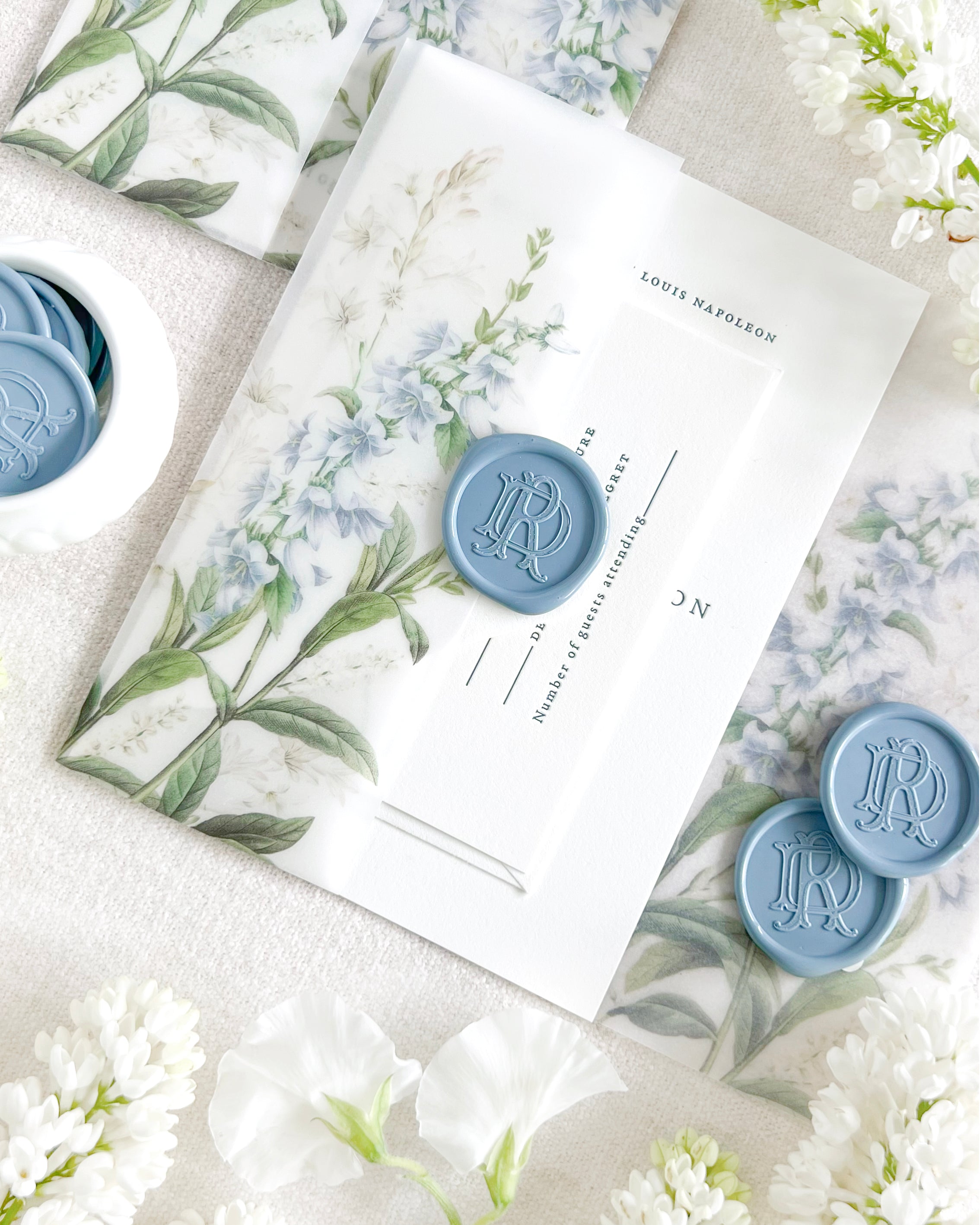 Enclose your suite in a luxurious layer of translucent vellum paper printed with your selection of botanical illustration, and finish it with a wax seal, ribbon, or both!