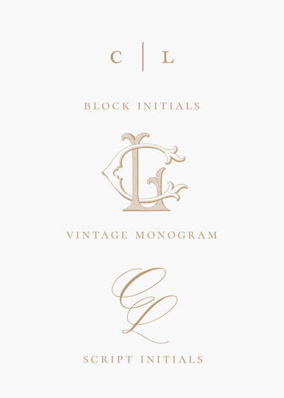 You may include a monogram or initials on any or all of your paper pieces at no additional cost. Block and script initials are designed with the fonts used within the suite, while vintage monograms are sourced from our library of double letter styles. Or, for an additional design fee, you may choose to book a custom vintage monogram with your suite.