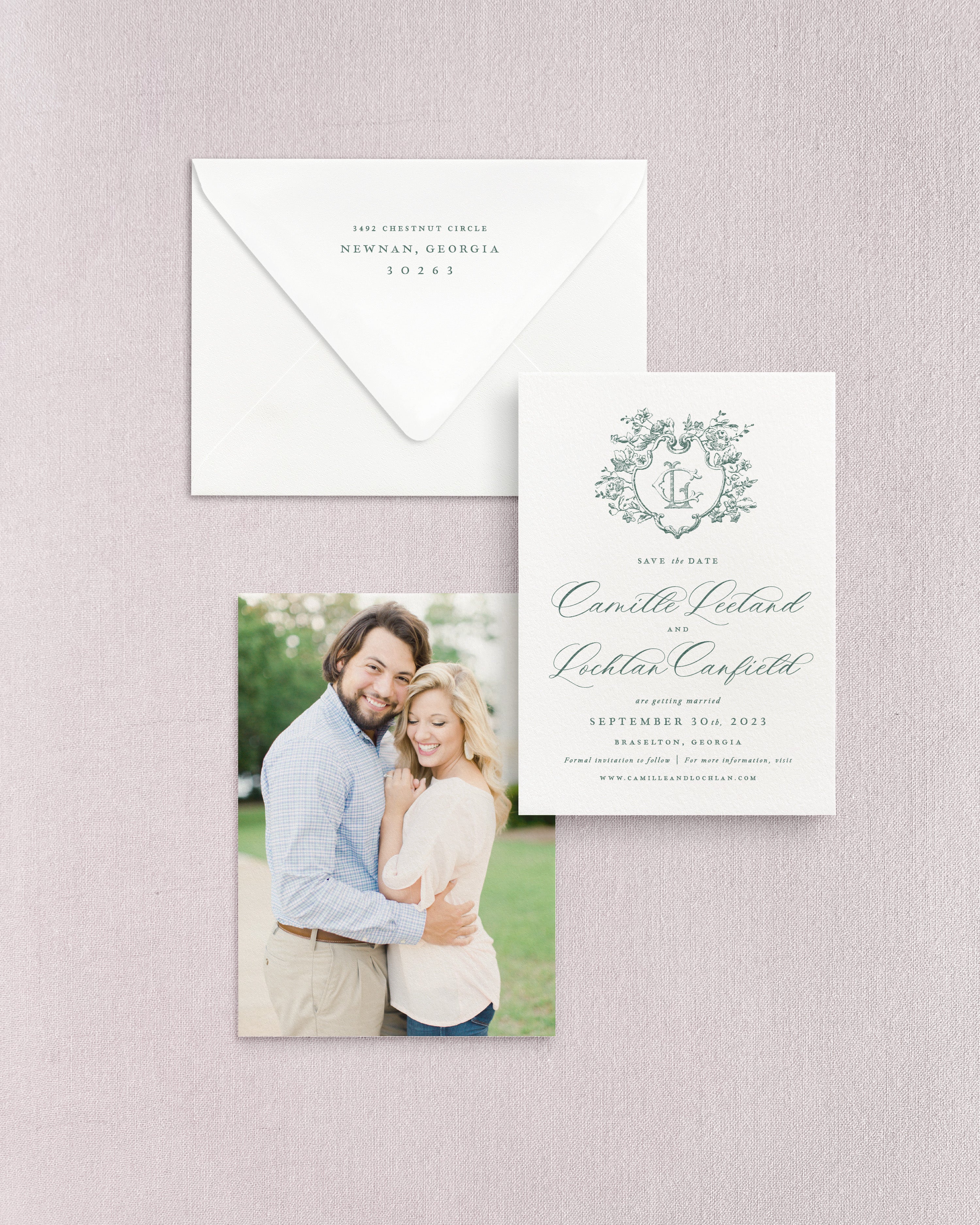 Classic composition meets an easy flowing script with our Camille Suite, giving a fresh approach to the traditional invitation design. We love this suite with a custom painting or drawing, but it pairs exquisitely with a monogrammed wreath or crest. Intentionally created with the Empress bride in mind, The Camille Suite is one you'll love for years to come.
