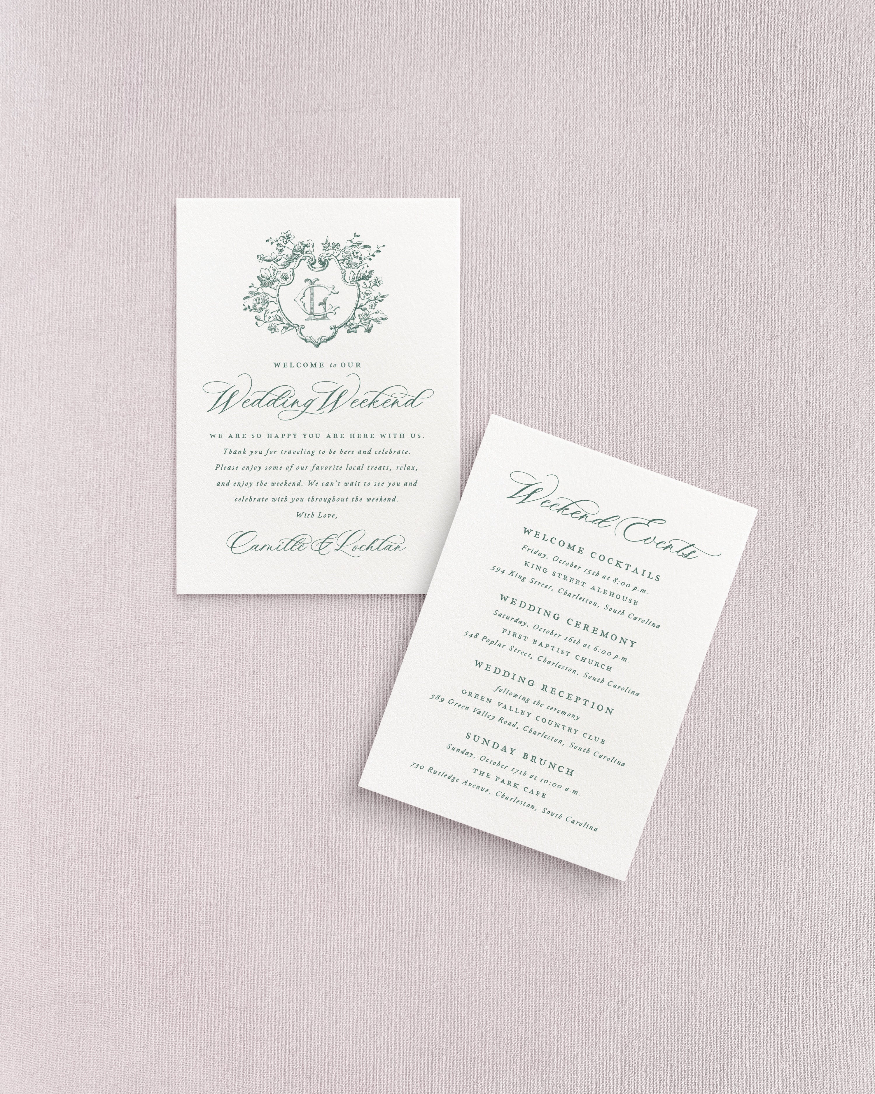 Your day of paper can include a crest or wreath of your choice, as well as a monogram or initials that you will select on the order form.