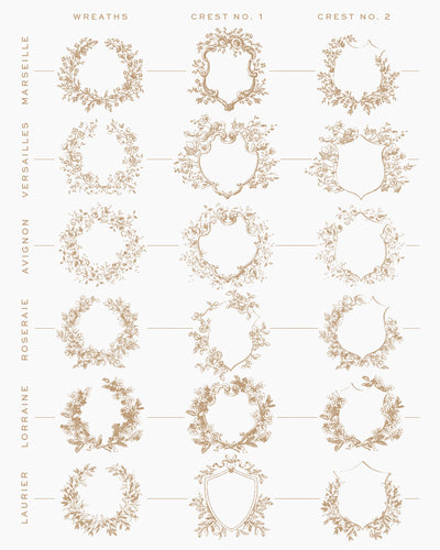 Crests are organized by Floral Story, so that you may easily pair embellishments that go hand-in-hand with your selection. What is a Floral Story? Click here!
