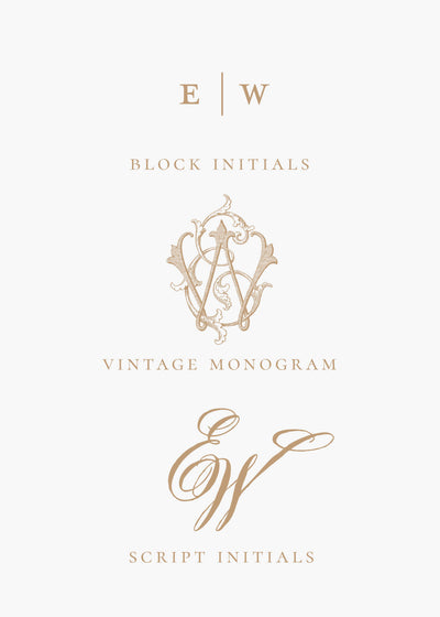 You may include a monogram or initials on any or all of your paper pieces at no additional cost. Block and script initials are designed with the fonts used within the suite, while vintage monograms are sourced from our library of double letter styles. Or, for an additional design fee, you may choose to book a custom vintage monogram with your suite.
