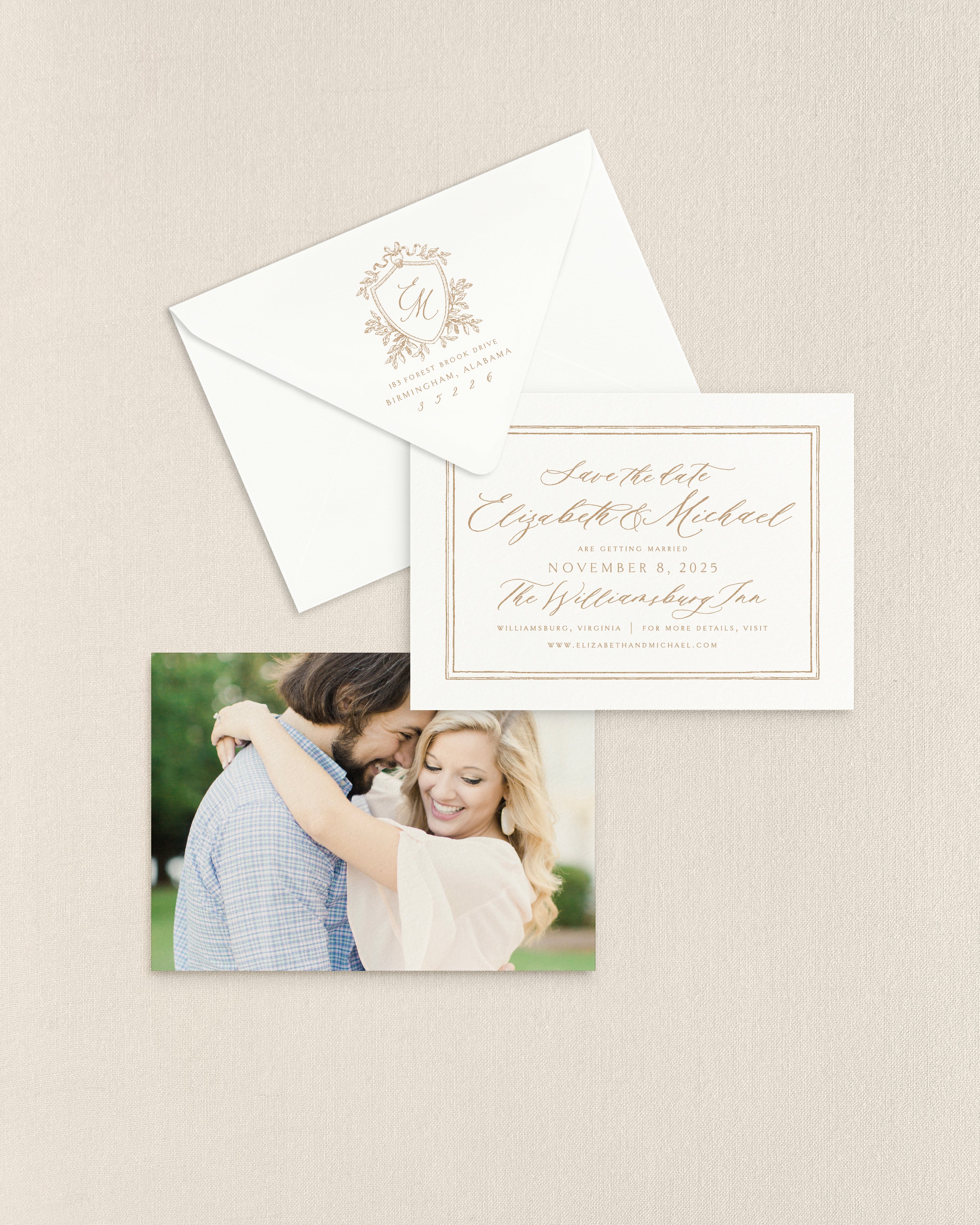 Adored for its unique composition and modern border design, the Elizabeth Suite is the perfect way to set the tone for your wedding day. With a selection of crests and monograms, as well as an expertly paired script and serif typesetting, Elizabeth showcases a timeless appeal and captivates with a hint of modern flair.