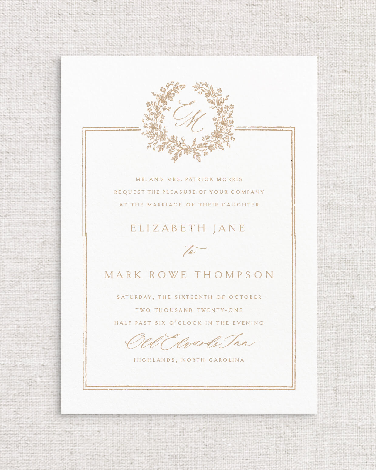 Adored for its unique composition and modern border design, the Elizabeth Suite is the perfect way to set the tone for your wedding day. With a selection of crests and monograms, as well as an expertly paired script and serif typesetting, Elizabeth showcases a timeless appeal and captivates with a hint of modern flair.