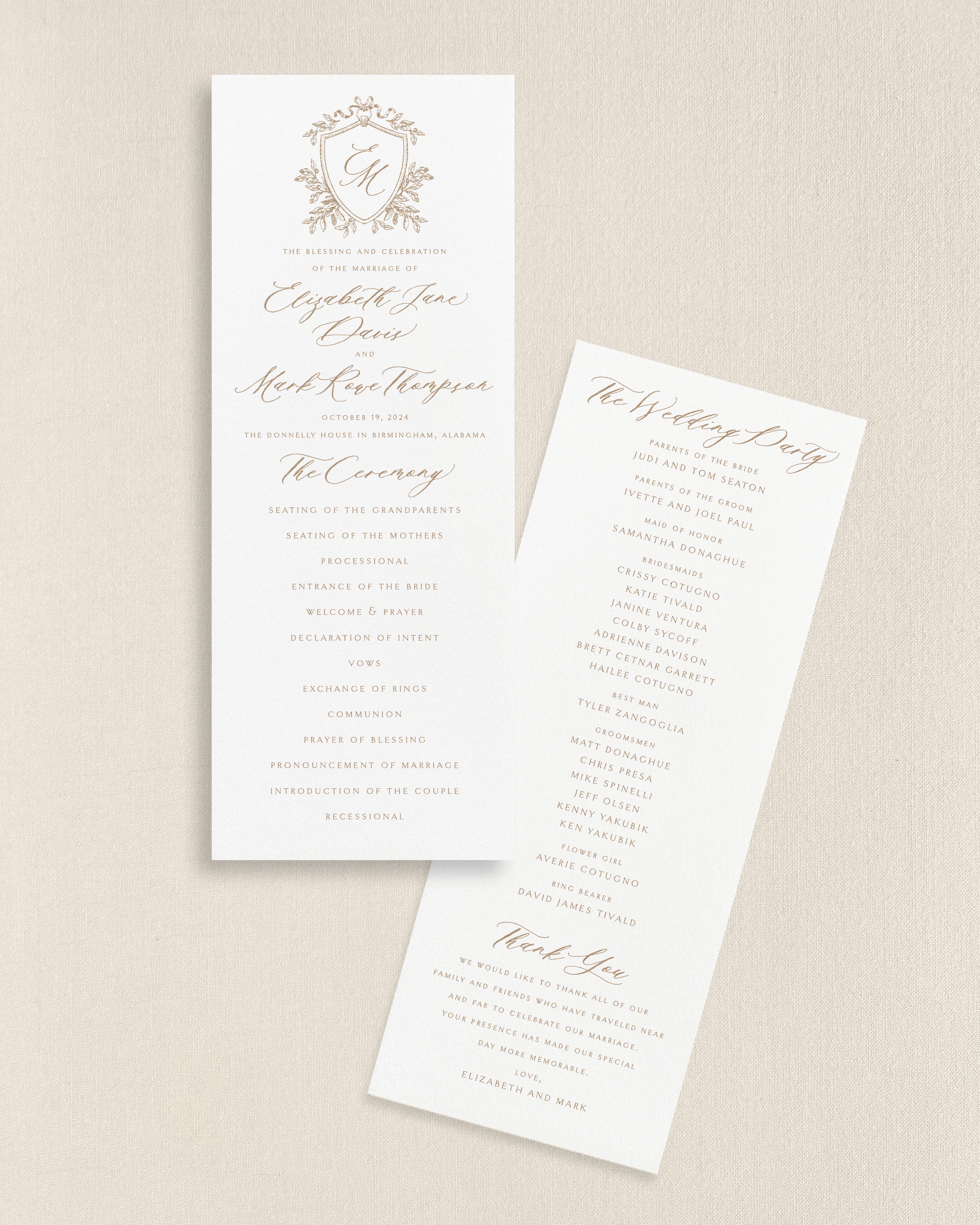 Your day of paper can include a crest or wreath of your choice, as well as a monogram or initials that you will select on the order form.