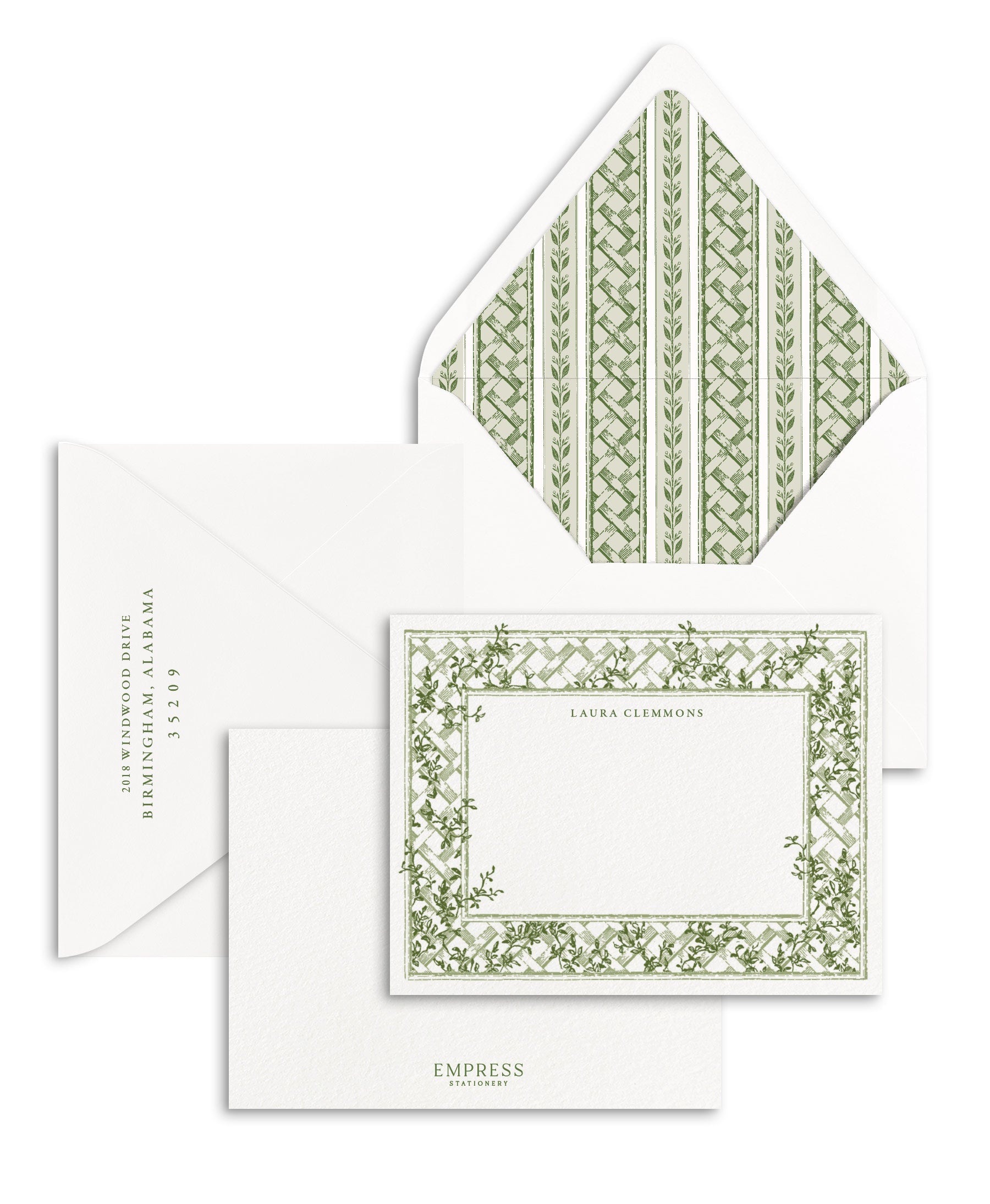 Inspired by classic garden architecture, this luxury green trellis note card set features a refined botanical border with climbing greenery layered over a timeless lattice pattern. The crisp rectangular note card is finished with elegant typography and paired with a coordinating envelope featuring a striped trellis envelope liner for a polished, tailored presentation.