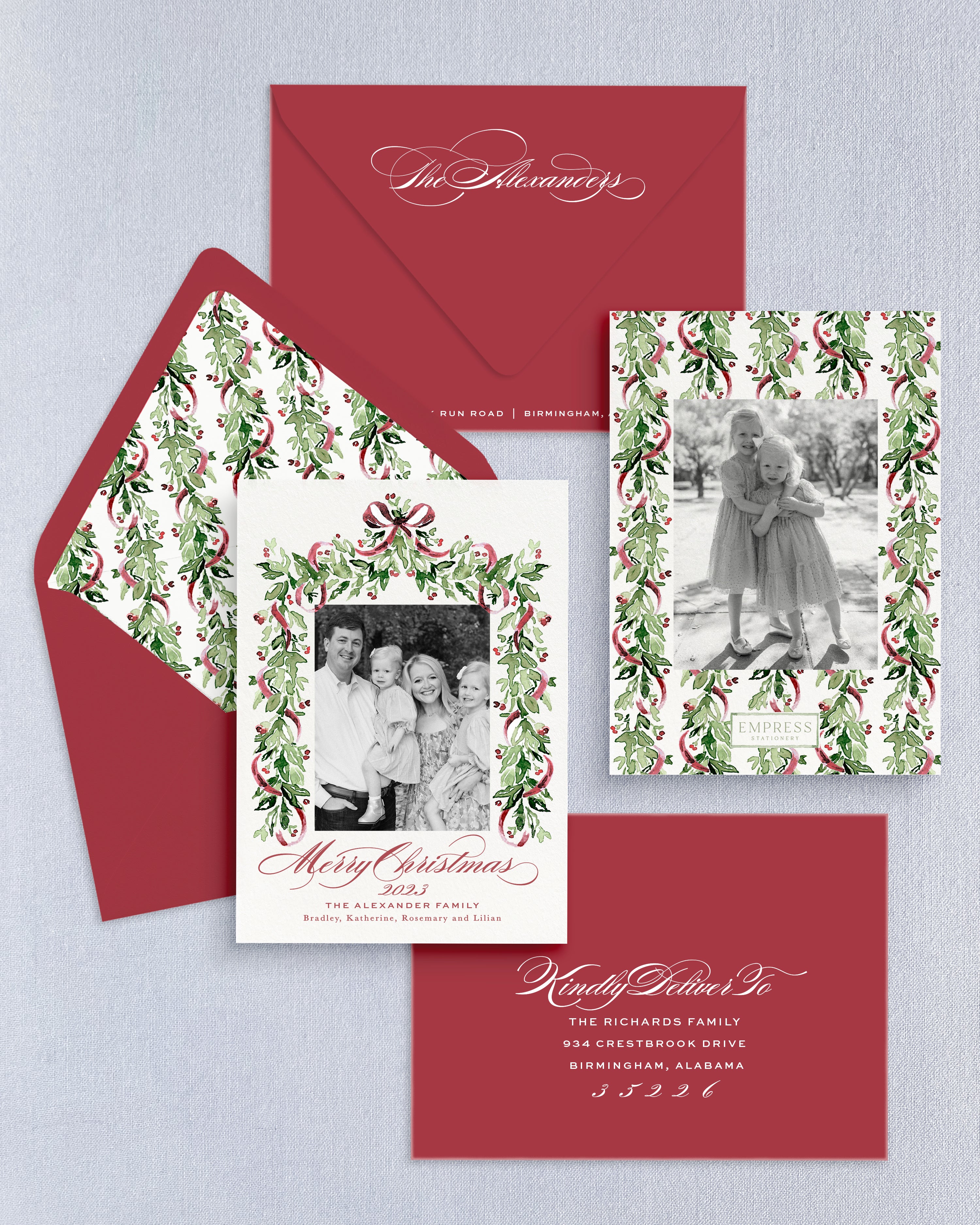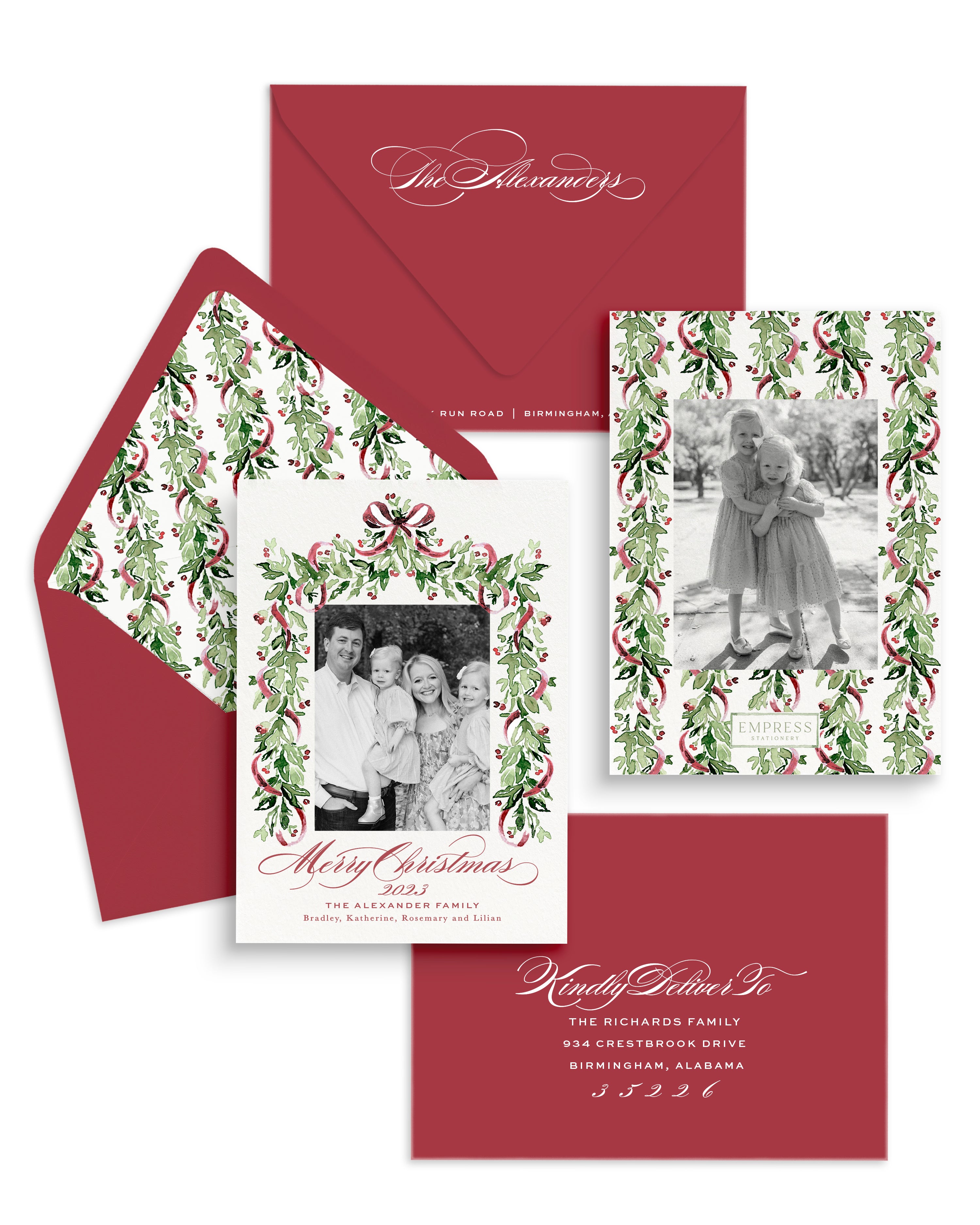 Can I change ink, paper or envelope color? Color customization is not available with our Christmas Collection. Inquire for Custom Christmas card availability by emailing clientcare@empressstationery.com