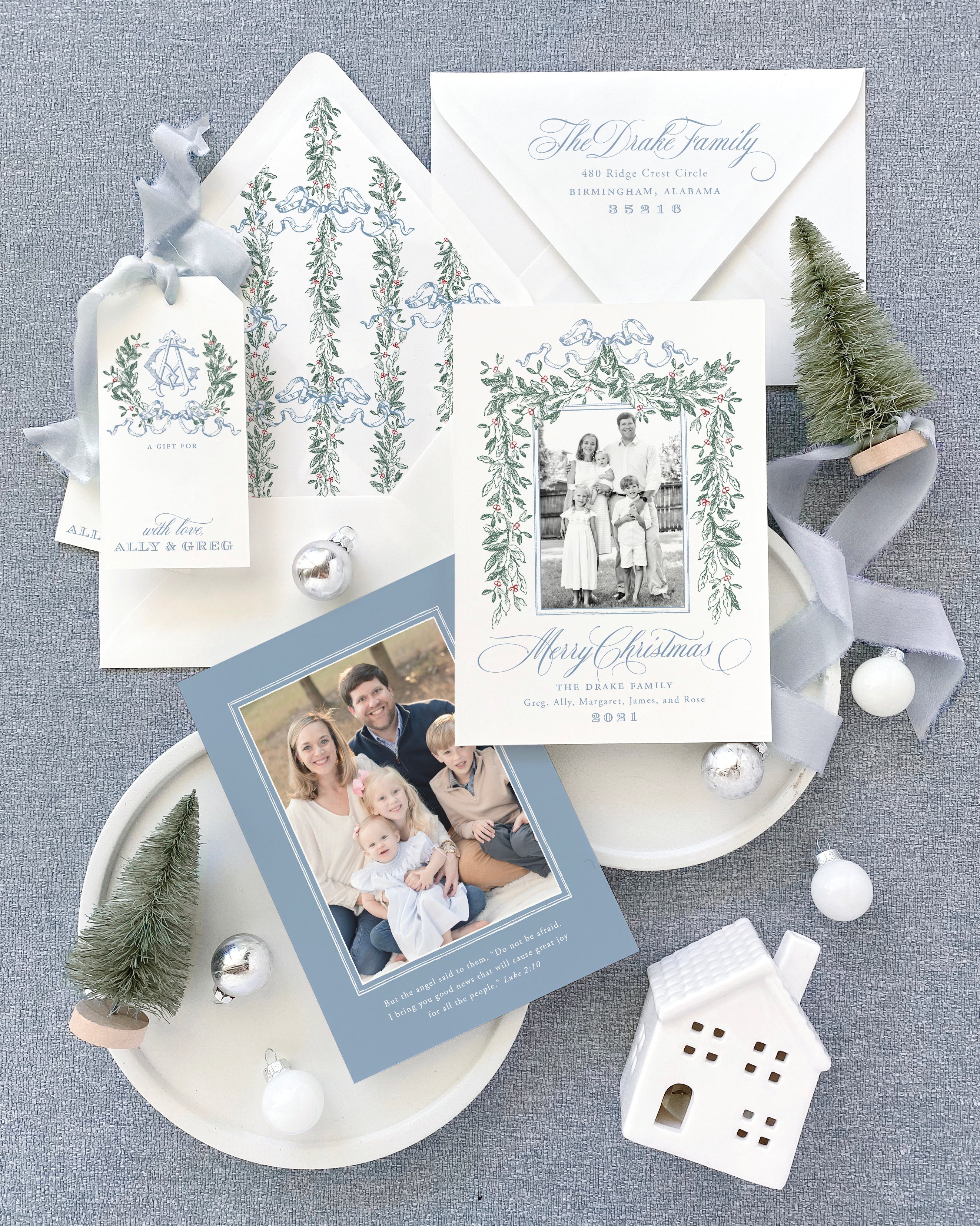 Let our Holly and Ribbon Christmas Card share the spirit of the season with your friends and family this year. The intricate seasonal greenery and ribbon design in shades of blue and green add a touch of classic sophistication. A true favorite with our clients year after year!
