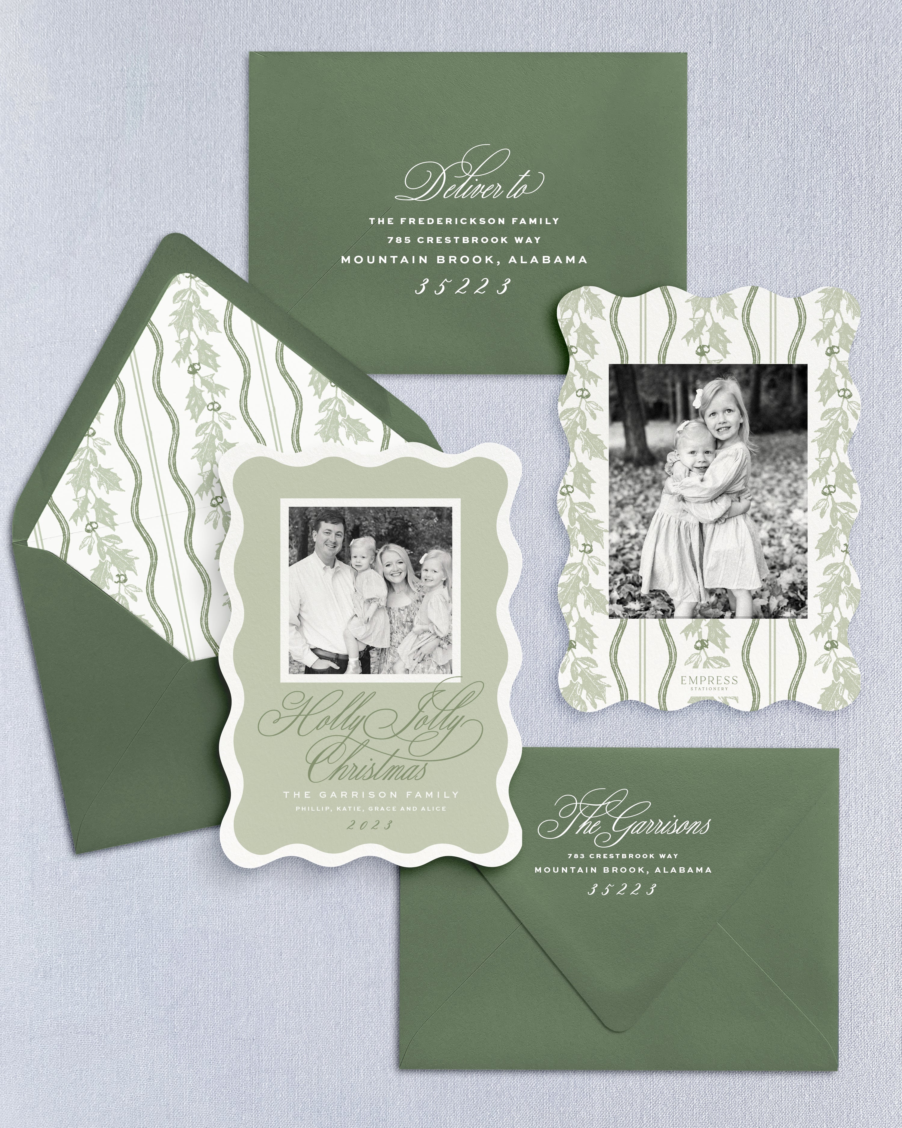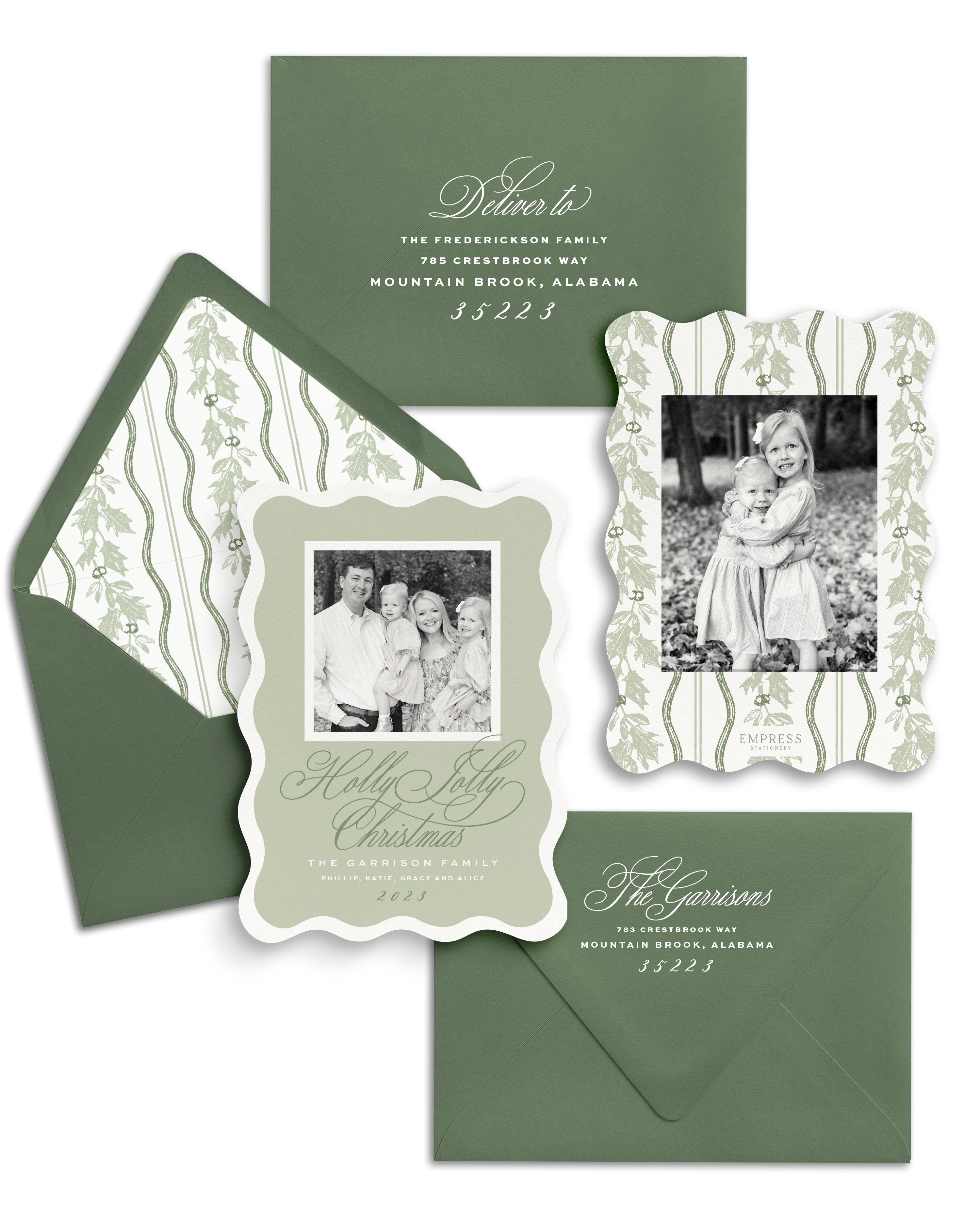 Our Holly Jolly Christmas Card is the perfect way to send warm holiday cheer to your family and friends. With its wavy-edged design and festive sage pattern, it's the perfect accompaniment to a joyous season.