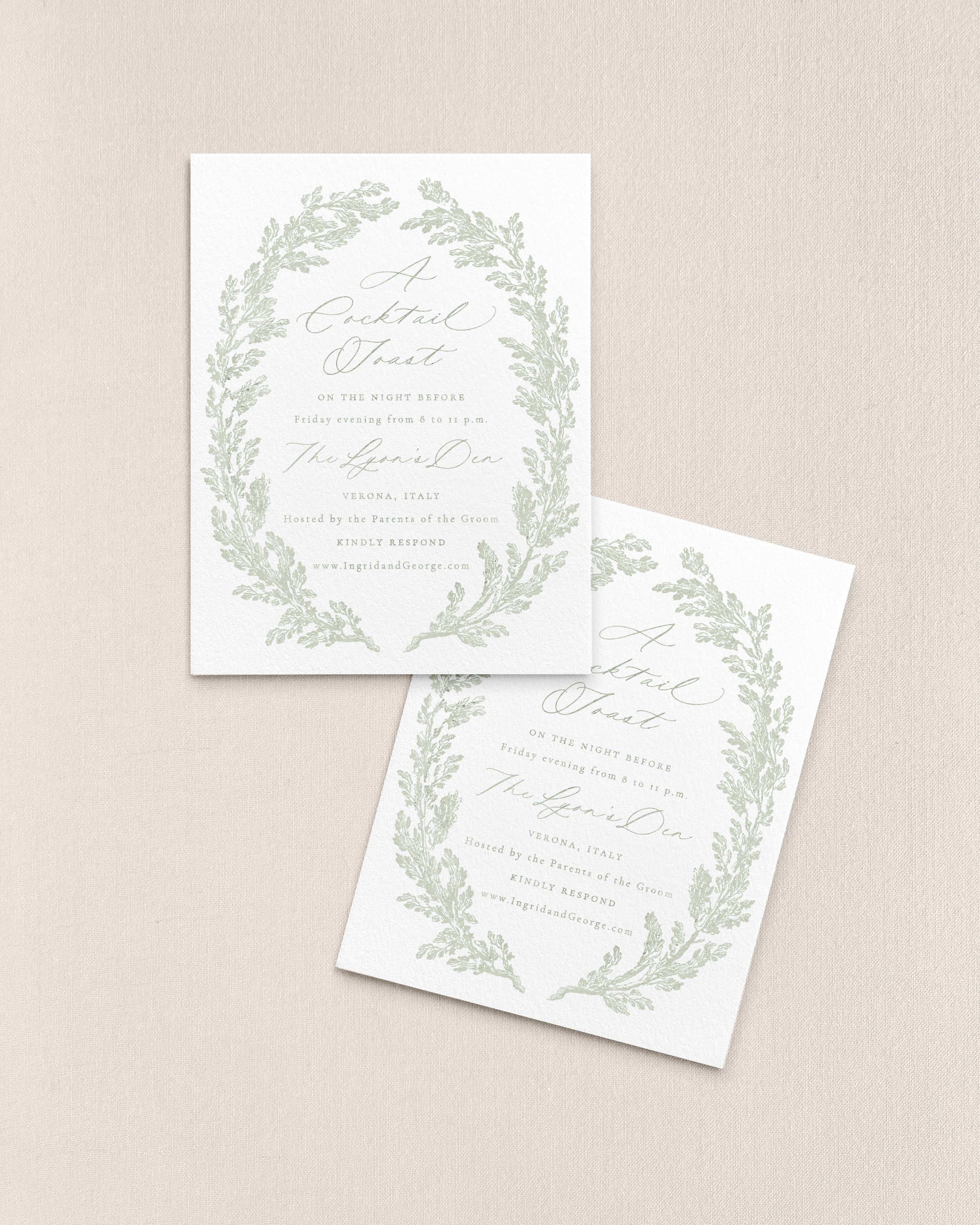 With a sophisticated, opulent appeal, Our Ingrid Suite is where old-world meets modern. A meticulously embellished border frames an understated typesetting, and not a detail is missed as this combination carries throughout the suite. A distinct design ideal for setting that luxurious yet sophisticated tone, Ingrid is one of our most unique suites in the collection.