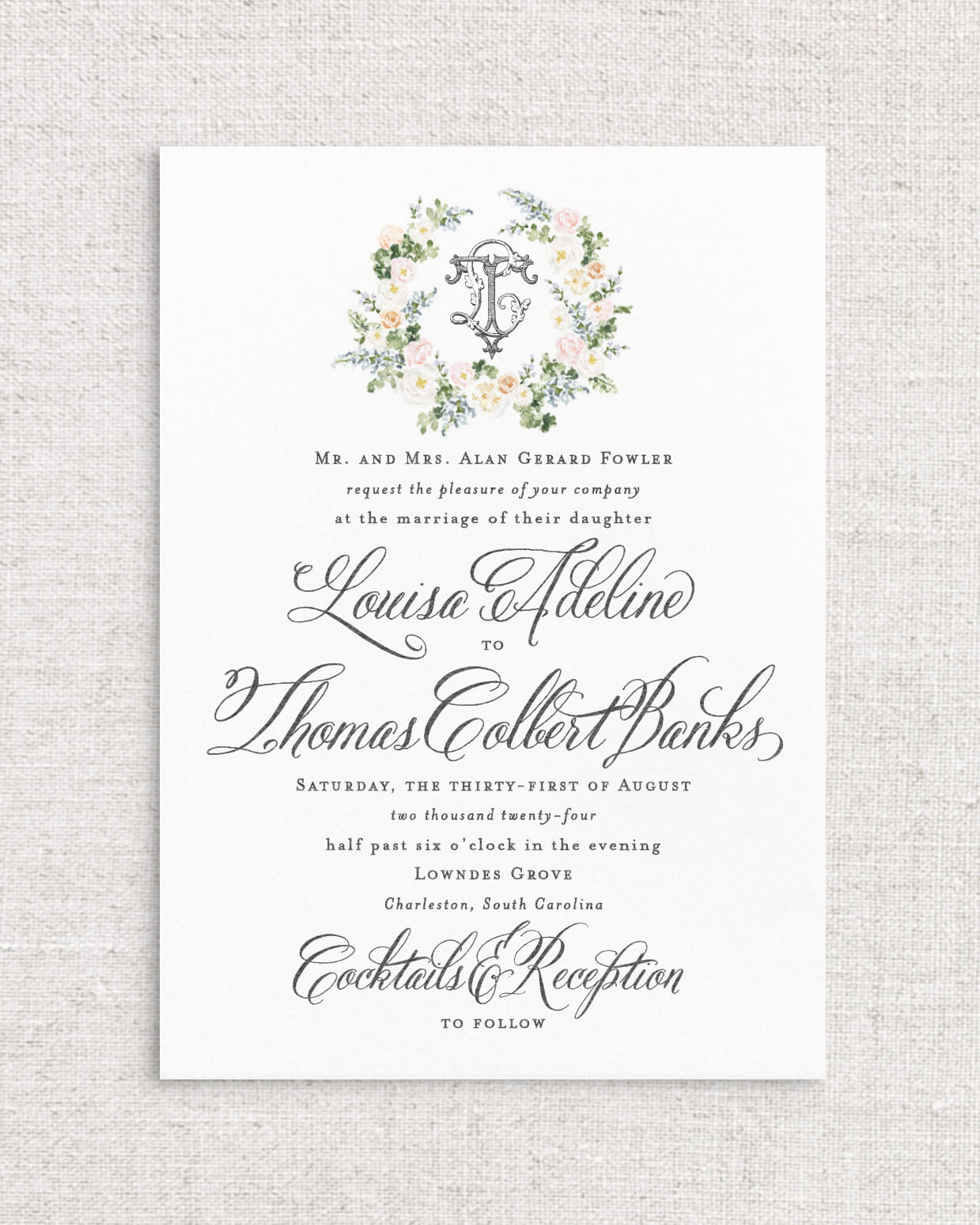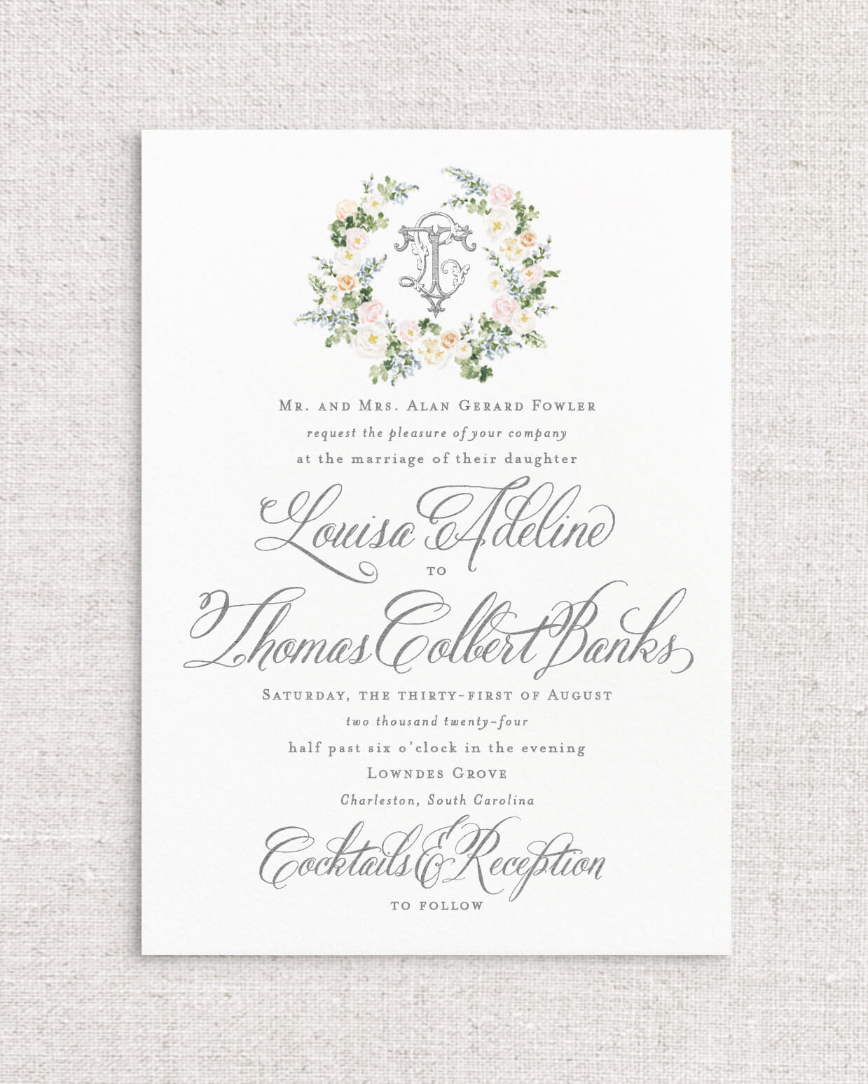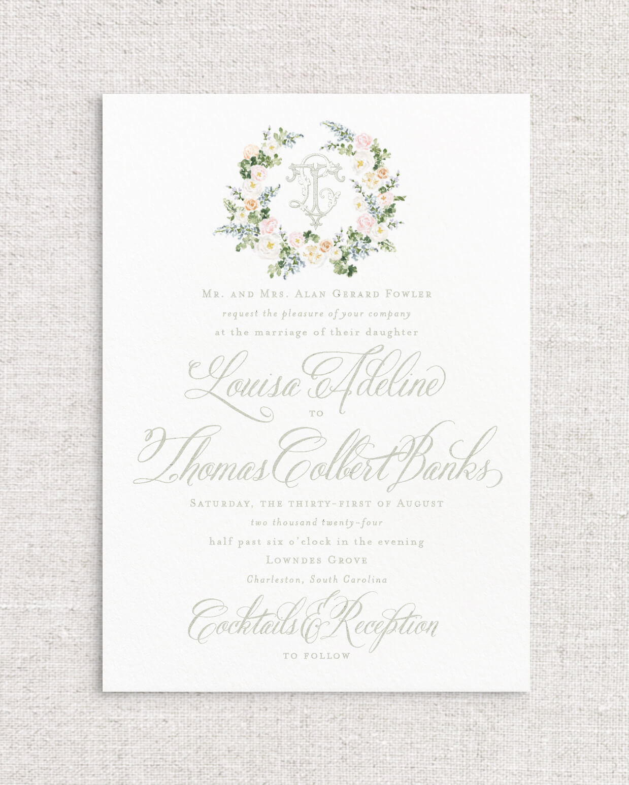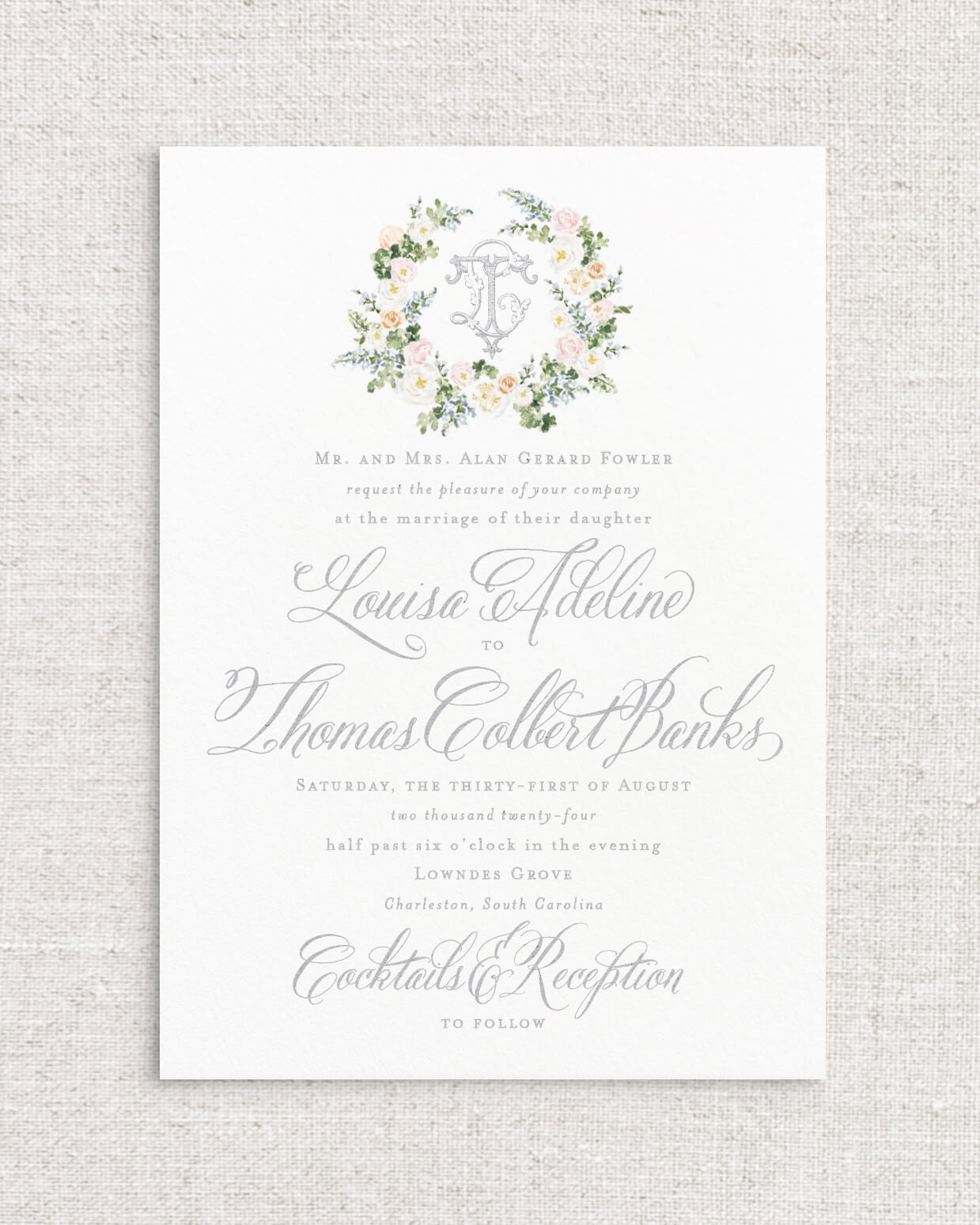 The Louisa Suite is the perfect combination of romantic Southern charm and whimsy with its selection of expertly painted watercolor florals and calligraphy styled script. This suite instantly sets the tone for an afternoon ceremony in the garden, or an elegant evening dancing beneath the stars. With multiple monogram style and floral detailed offerings, Louisa is a true client favorite.