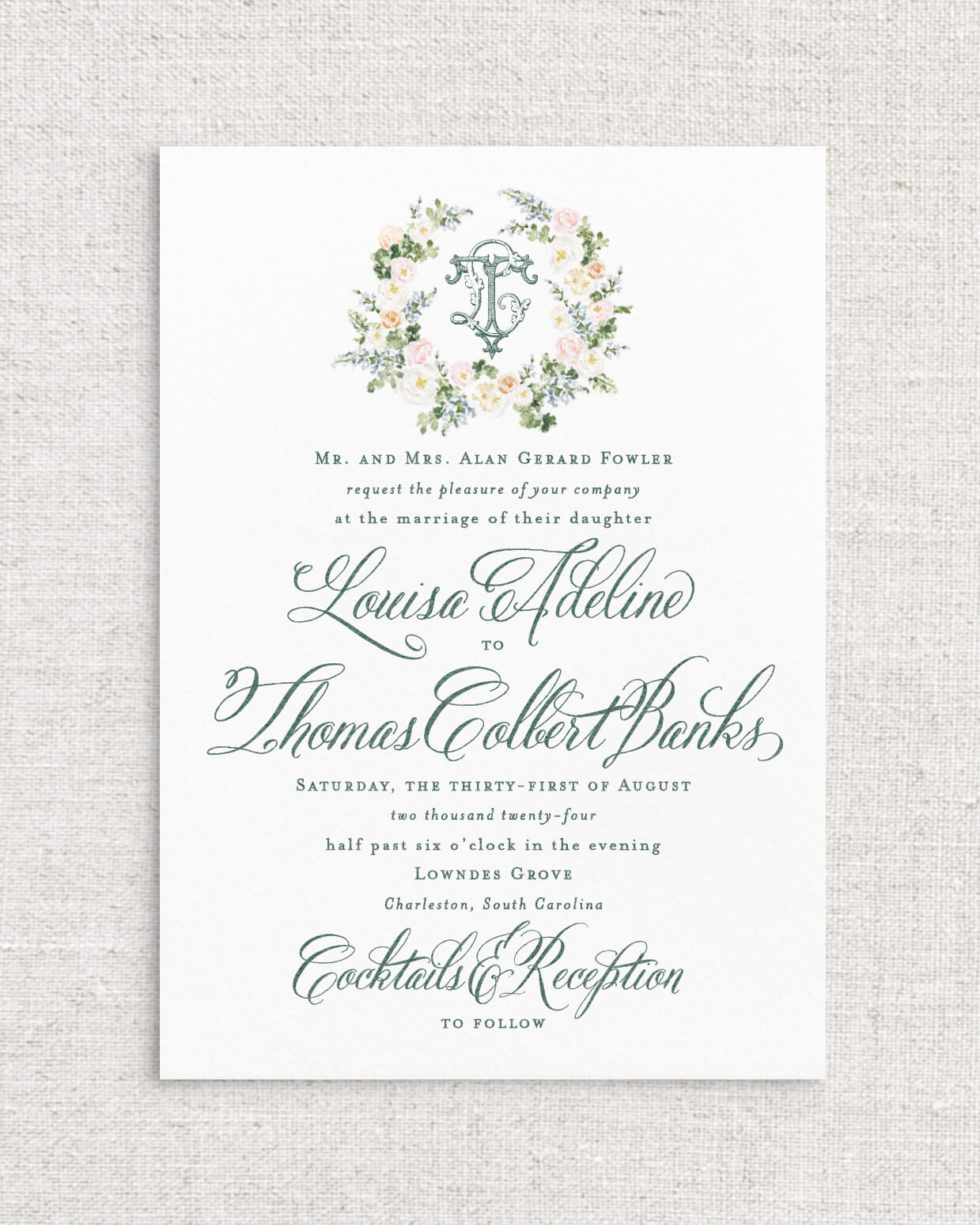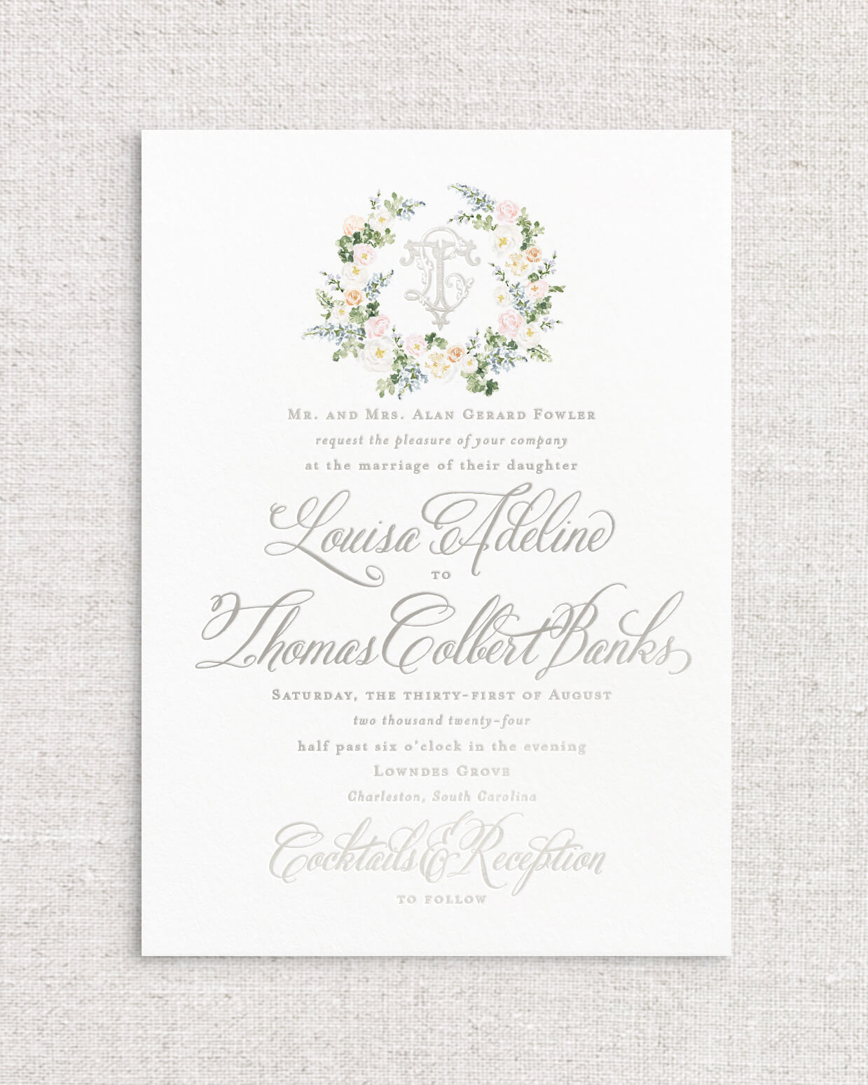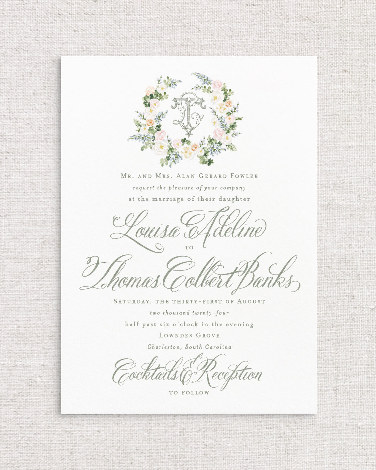 The Louisa Suite is the perfect combination of romantic Southern charm and whimsy with its selection of expertly painted watercolor florals and calligraphy styled script. This suite instantly sets the tone for an afternoon ceremony in the garden, or an elegant evening dancing beneath the stars. With multiple monogram style and floral detailed offerings, Louisa is a true client favorite.