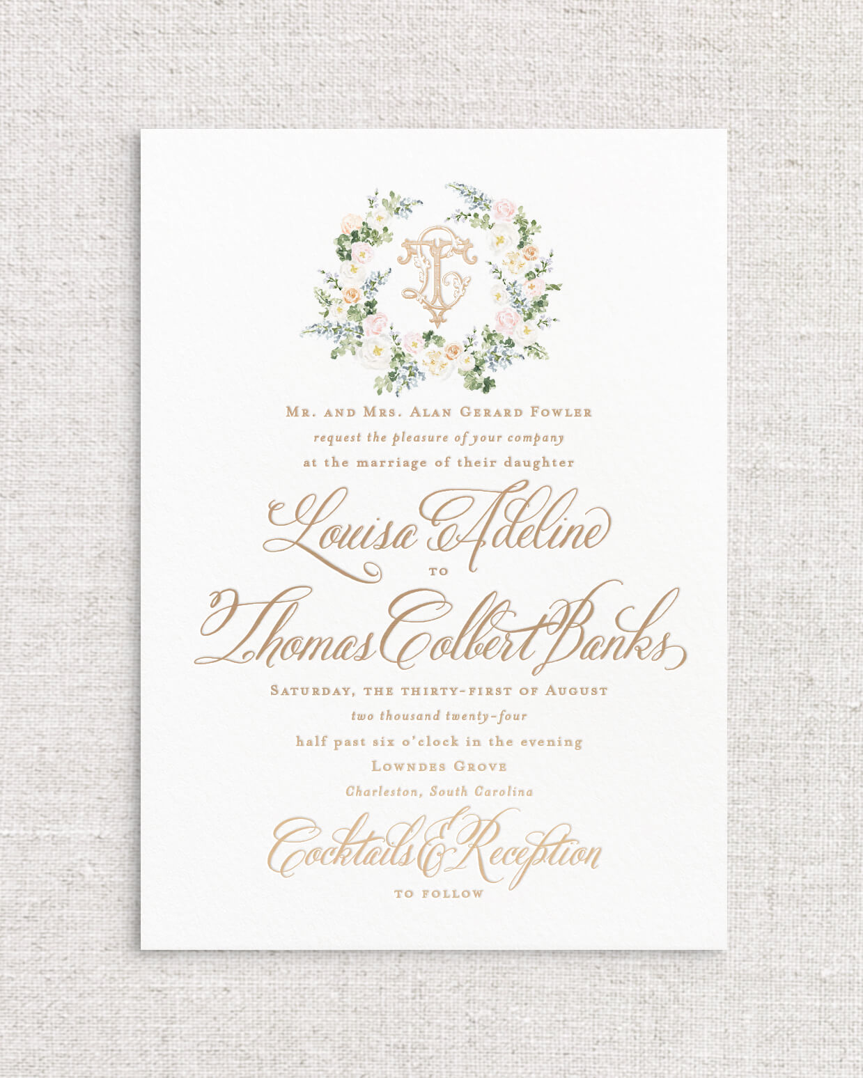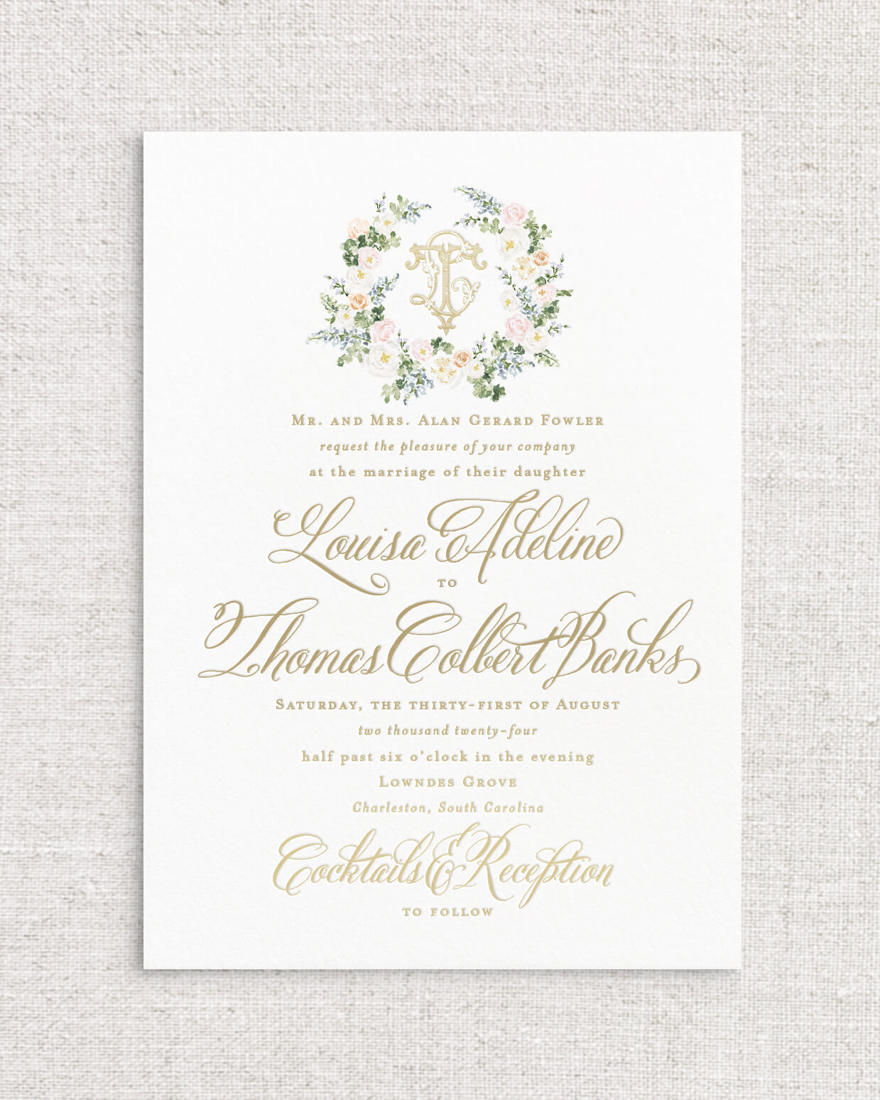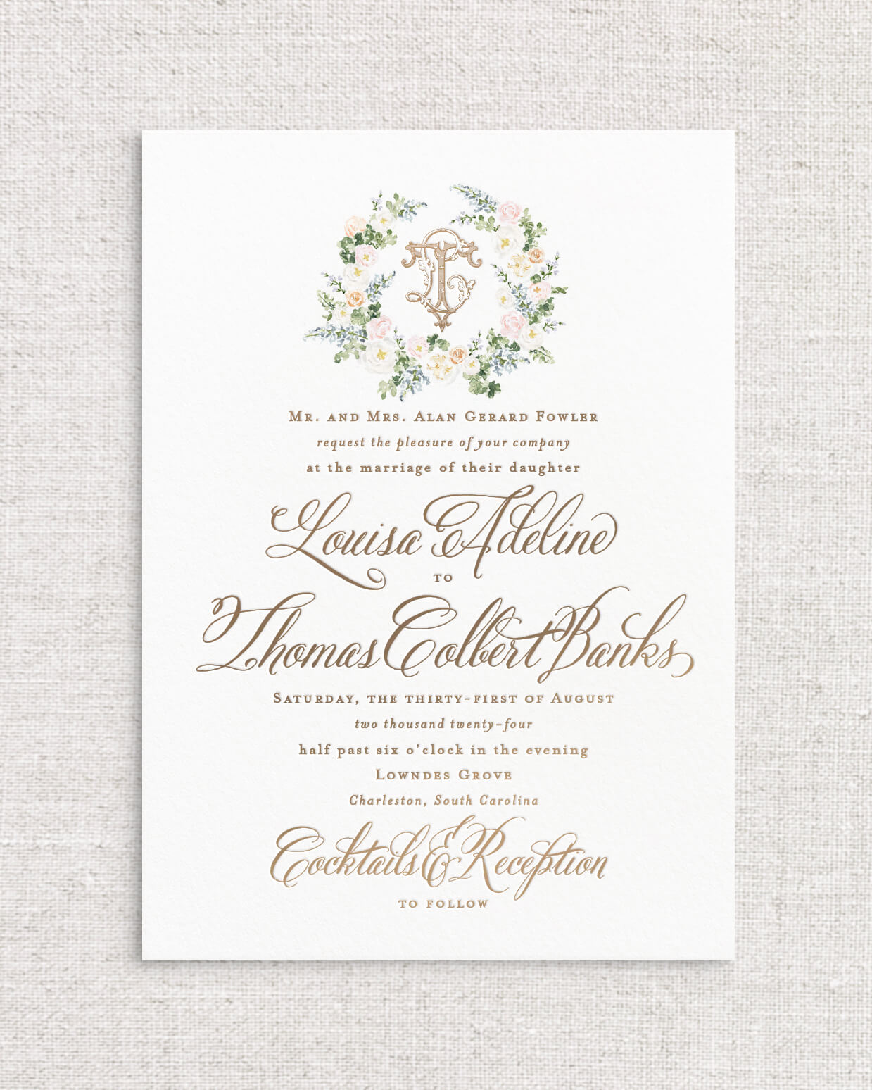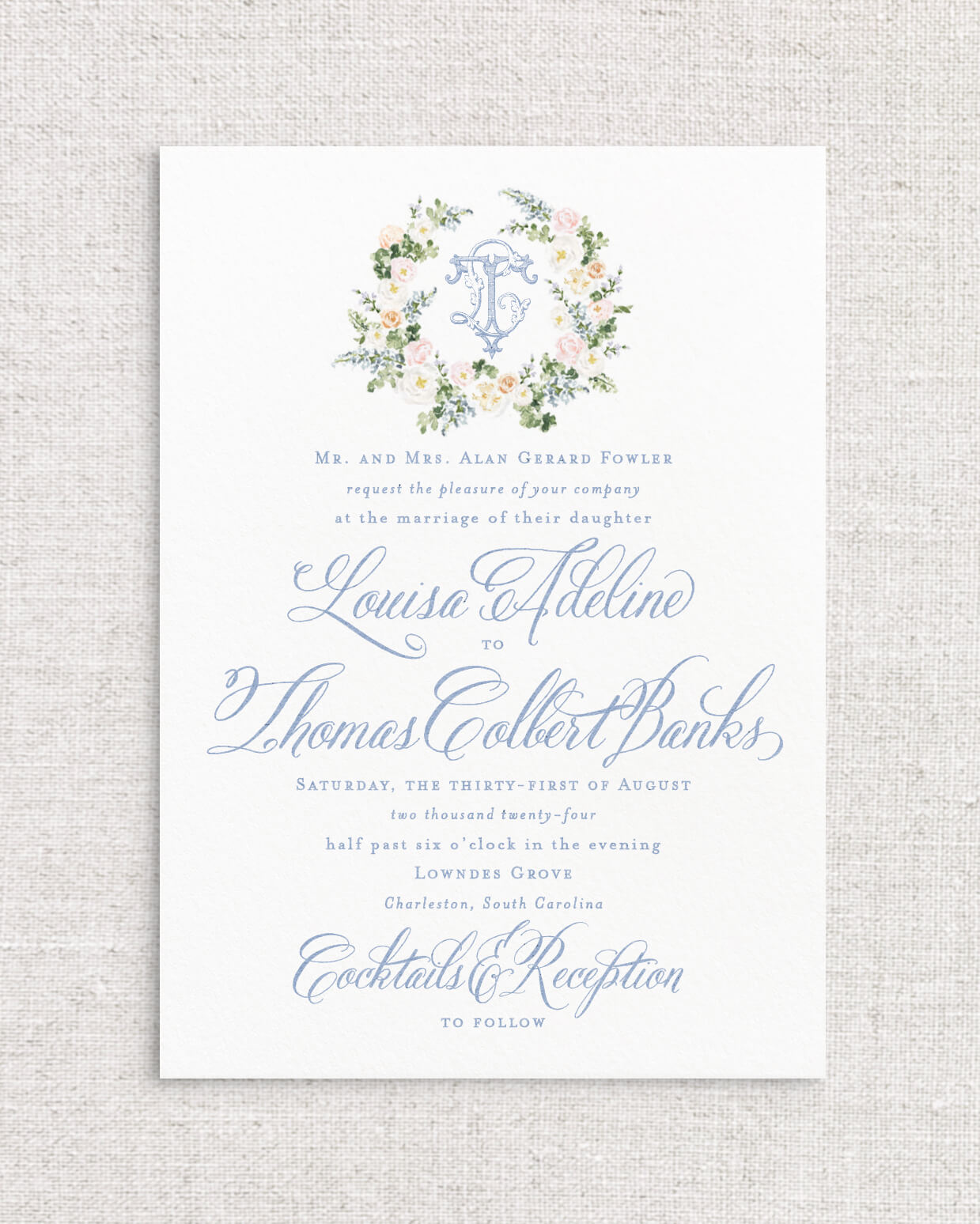The Louisa Suite is the perfect combination of romantic Southern charm and whimsy with its selection of expertly painted watercolor florals and calligraphy styled script. This suite instantly sets the tone for an afternoon ceremony in the garden, or an elegant evening dancing beneath the stars. With multiple monogram style and floral detailed offerings, Louisa is a true client favorite.