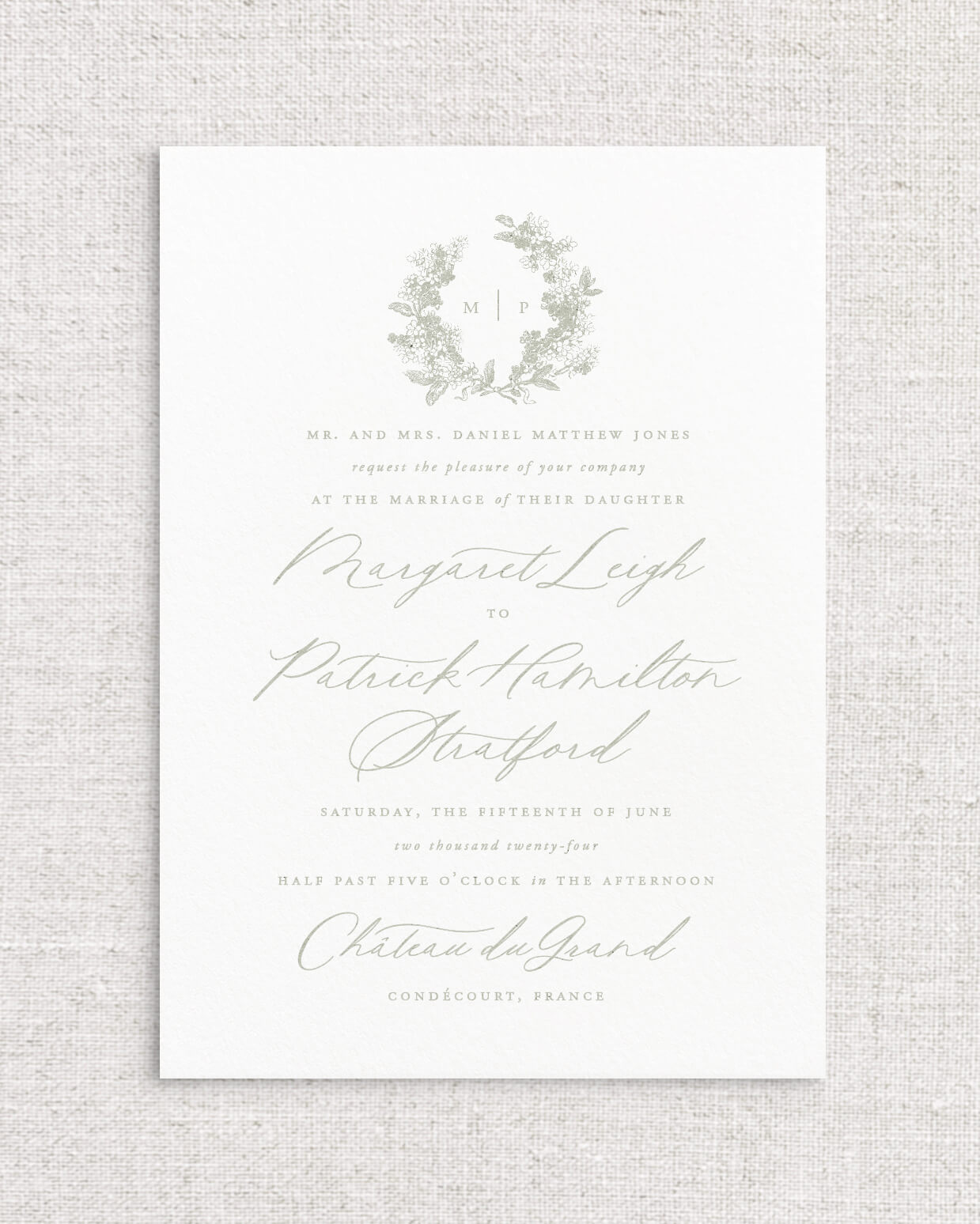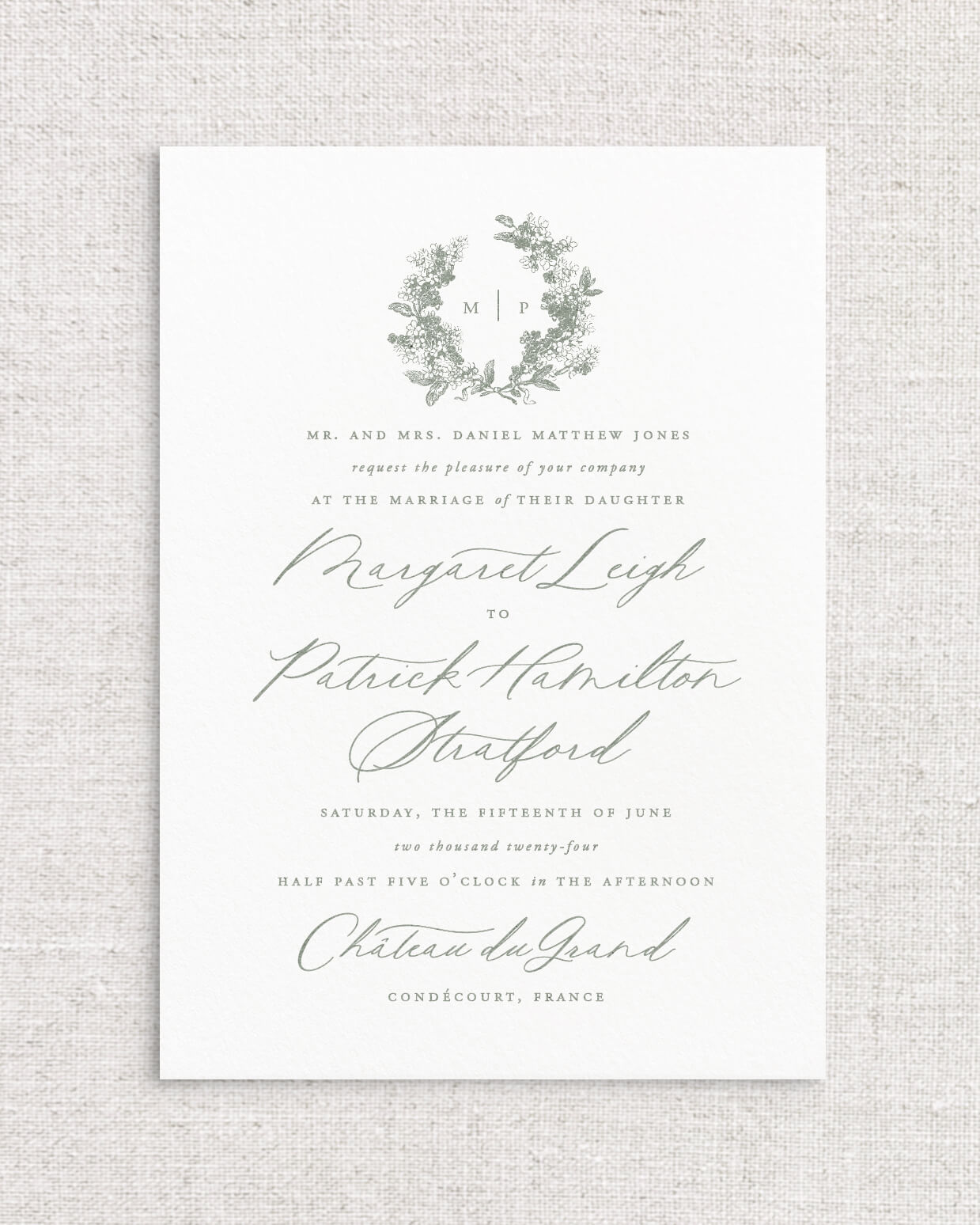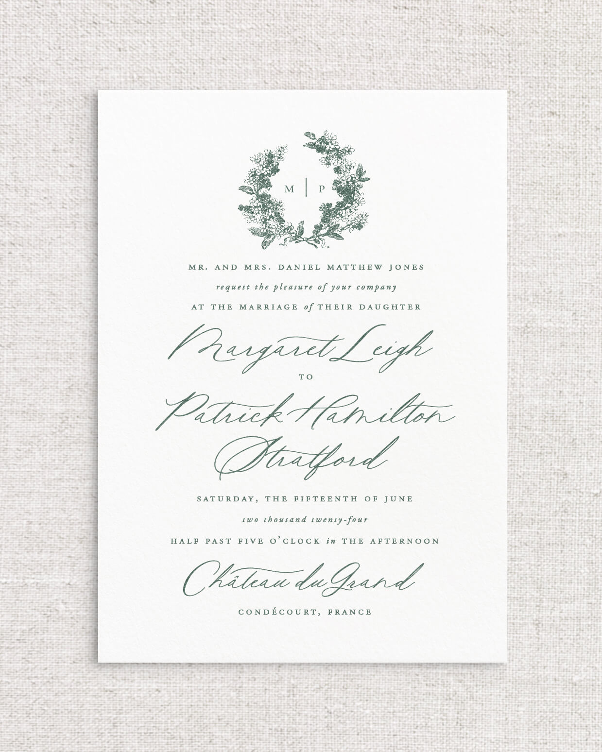 A classic choice for modern couples, The Margaret Suite offers relaxed sophistication, minimal elegance, and versatile design. Contemporary script lettering meets a steady serif with this pairing of intentionality. Margaret welcomes custom artwork like watercolor and hand drawn details, as well as a selection of wreaths, crests, and monograms.