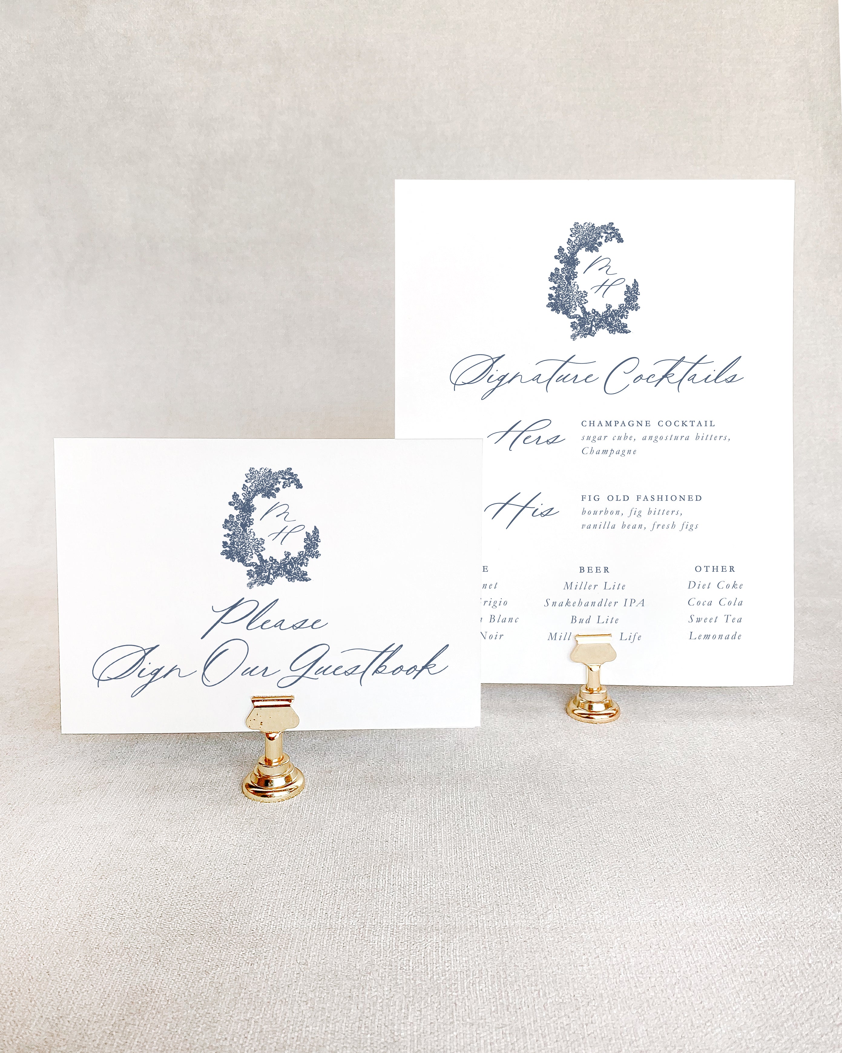 A classic choice for modern couples, The Margaret Suite offers relaxed sophistication, minimal elegance, and versatile design. Contemporary script lettering meets a steady serif with this pairing of intentionality. Margaret welcomes custom artwork like watercolor and hand drawn details, as well as a selection of wreaths, crests, and monograms.