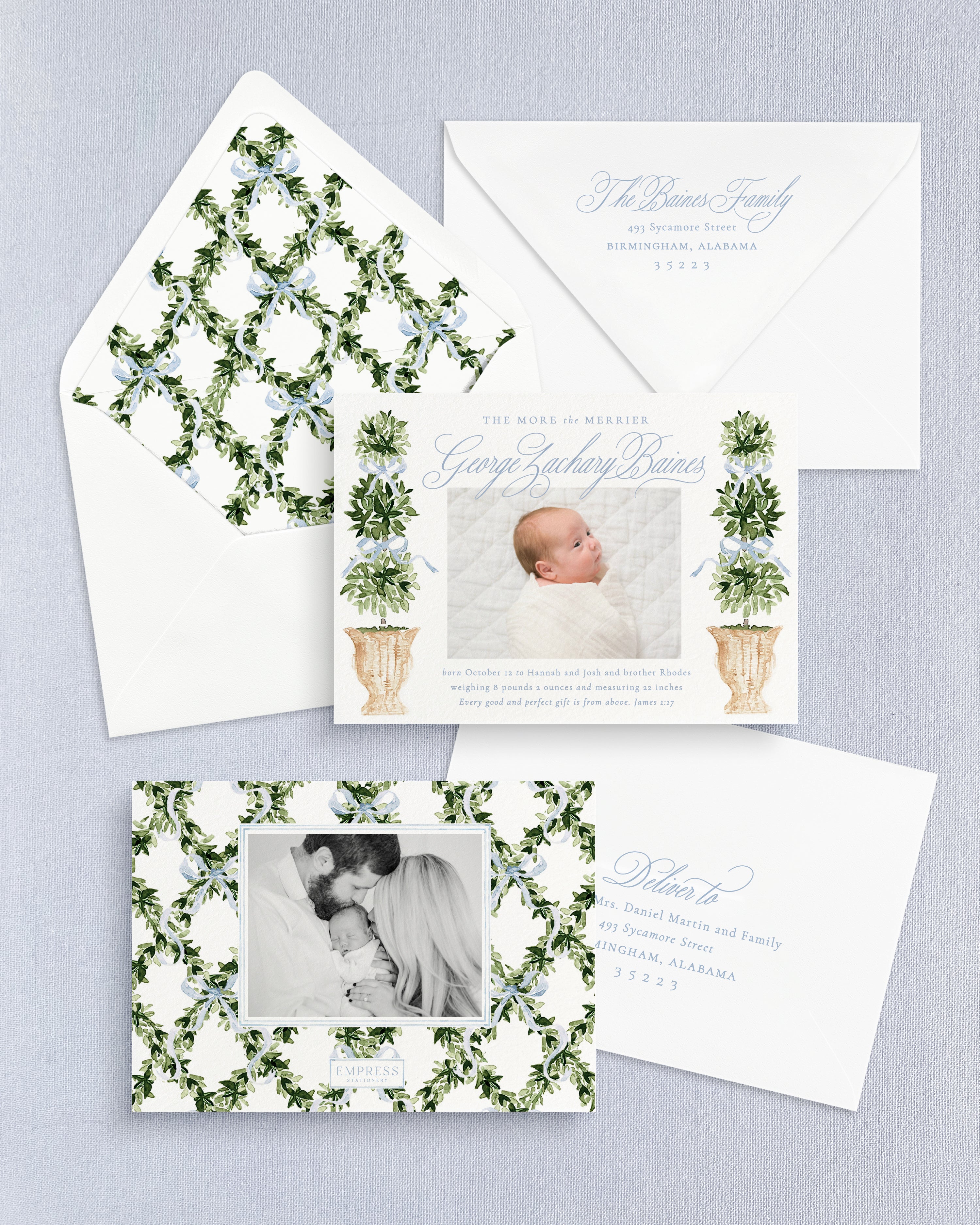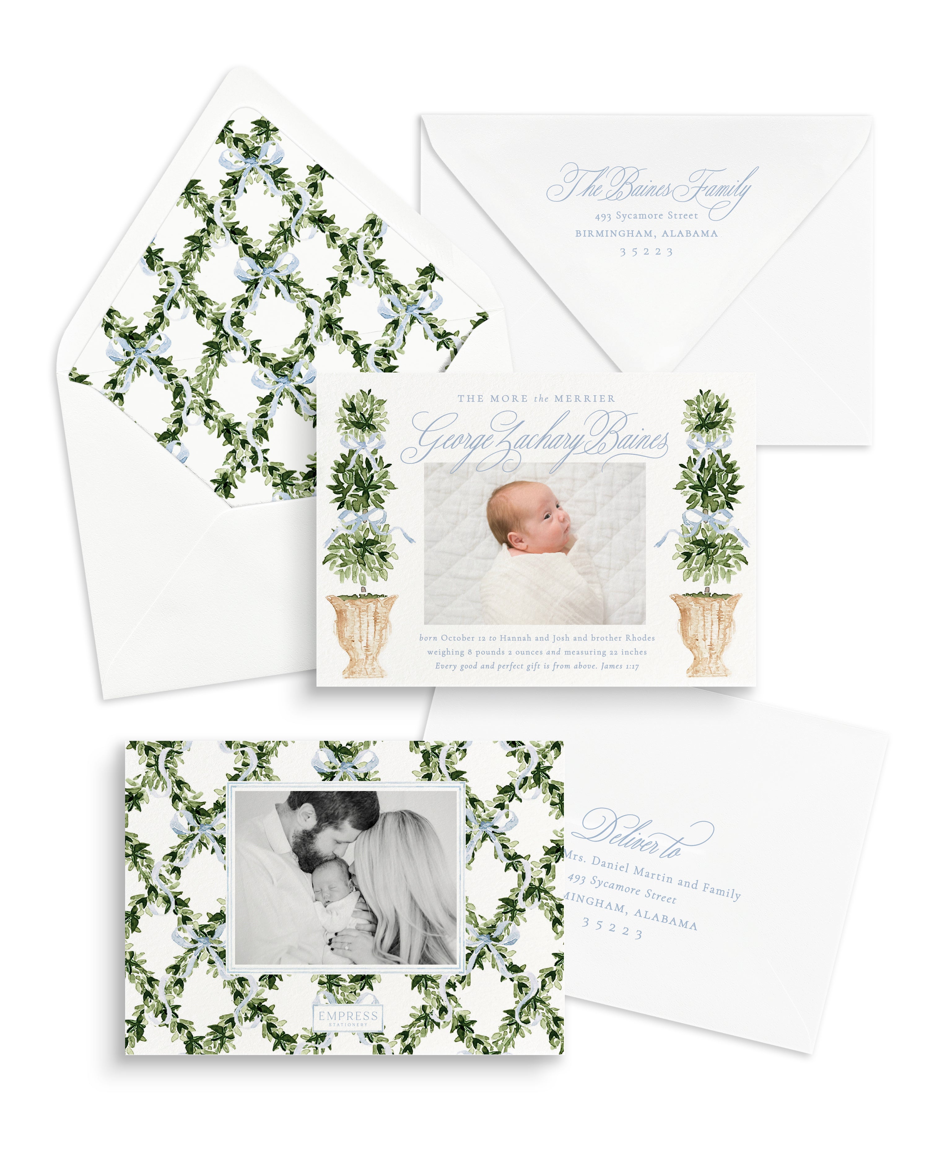 Our More the Merrier card is illustrated with a classic topiary, ribbon, and charming pastel watercolor palette. This joyous card welcomes the newest addition to your life with an announcement to your friends and family.
