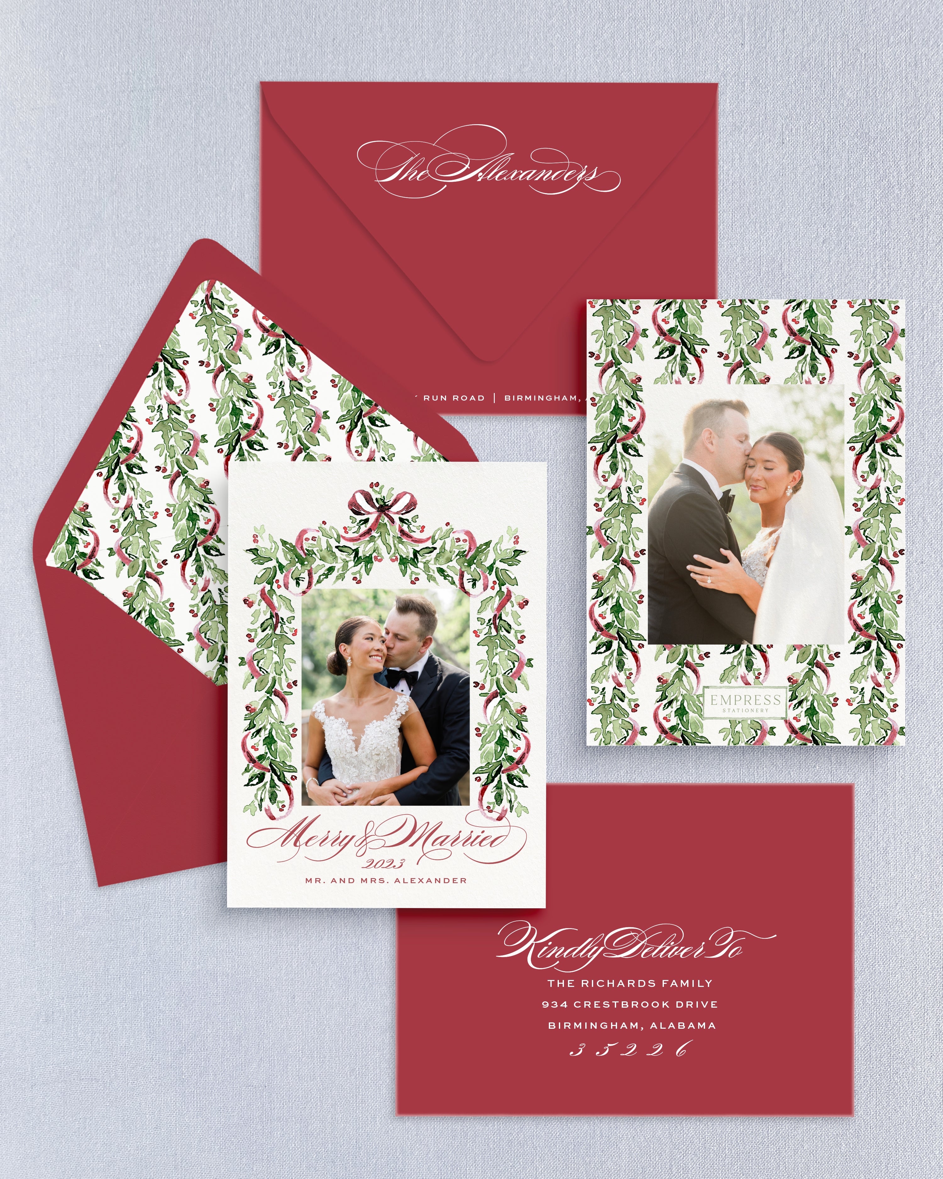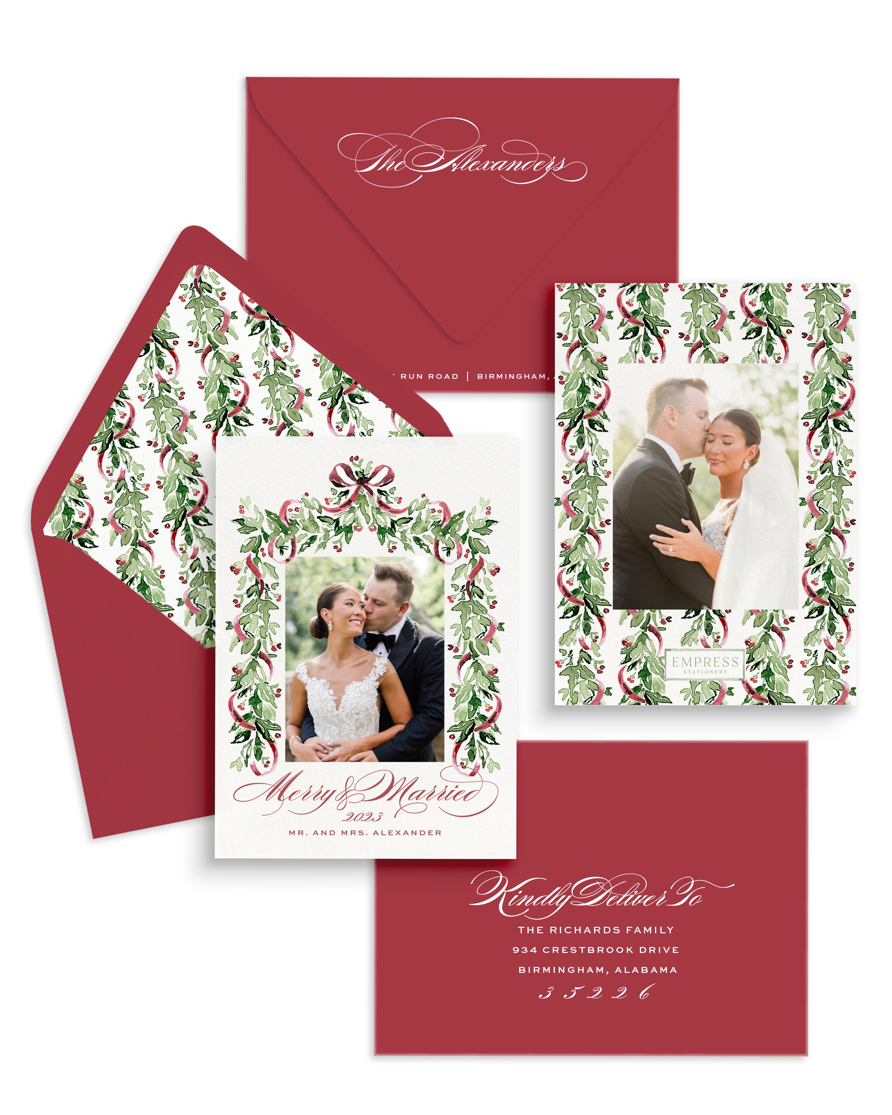 Welcome the holiday season with the Garland & Bow Christmas card. Adorned with a watercolor garland of greenery, tied together with a festive bow, it's the perfect way to spread the joy of your newlywed era.