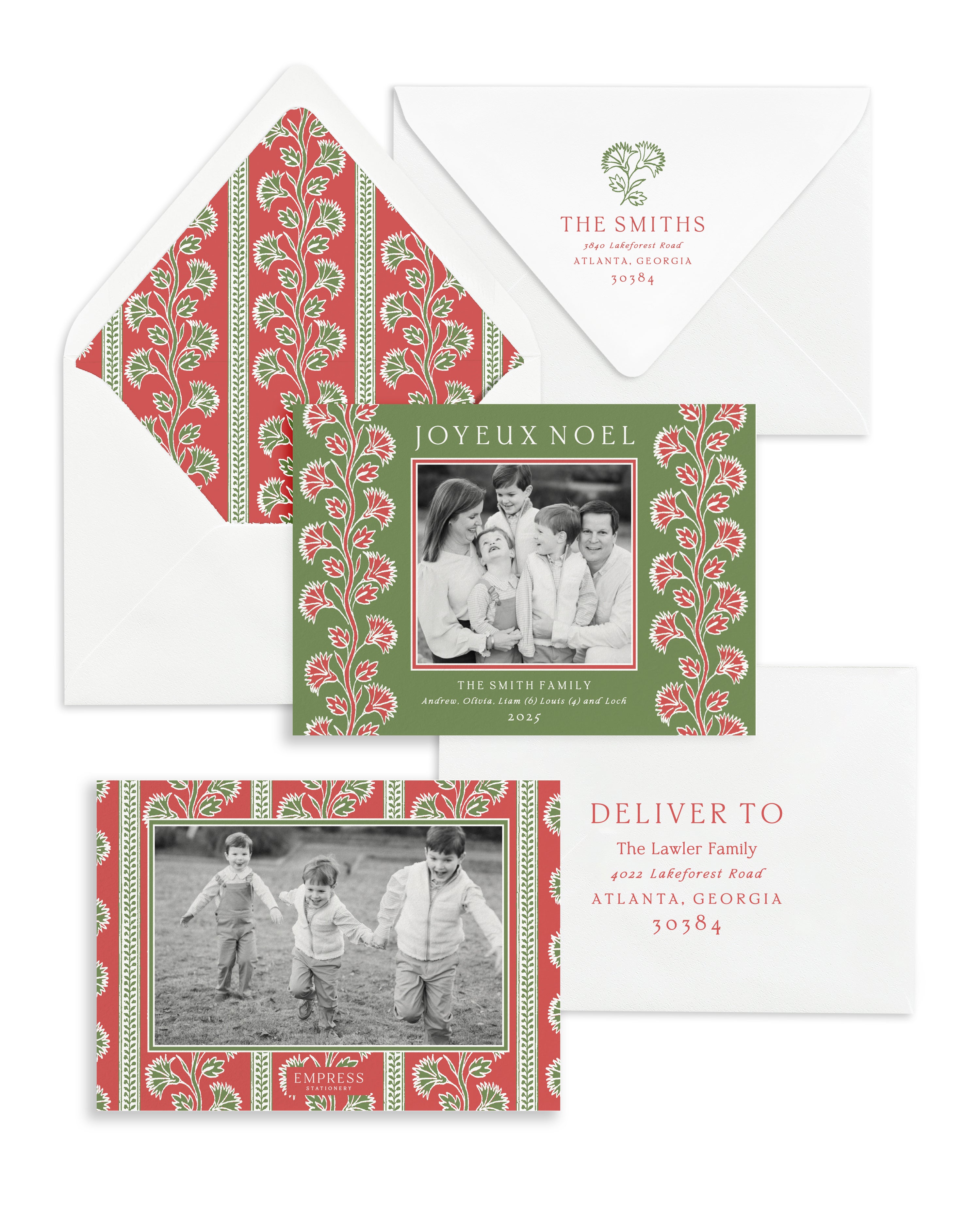 Bring festive cheer with this red and green patterned Christmas card inspired by traditional block prints. The bold floral motif creates a joyful frame for your family photo, while the French “Joyeux Noël” adds an extra touch of holiday sophistication. Coordinating envelope liners and printed addressing elevate the look, making these cards as easy as they are beautiful. A perfect choice for families who love vibrant, timeless holiday stationery with a refined Southern feel.