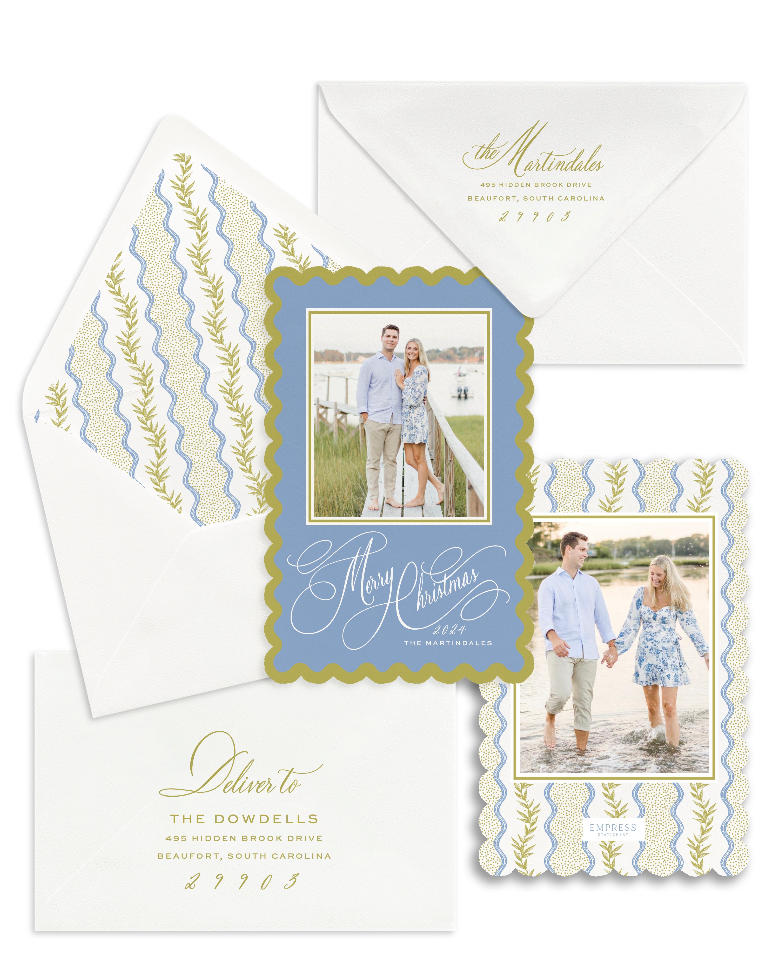 Have a Coastal Christmas with our Scallop and Laurel Christmas card! Inspired by the charm of the South Carolina coast, this large format card features scallop die cut edges, a fresh color palette of bright blue and chartreuse, and the most fun patterned liner you'll see this season. Perfect for couples, family and children's portraits, or anyone wanting to spread coastal cheer.