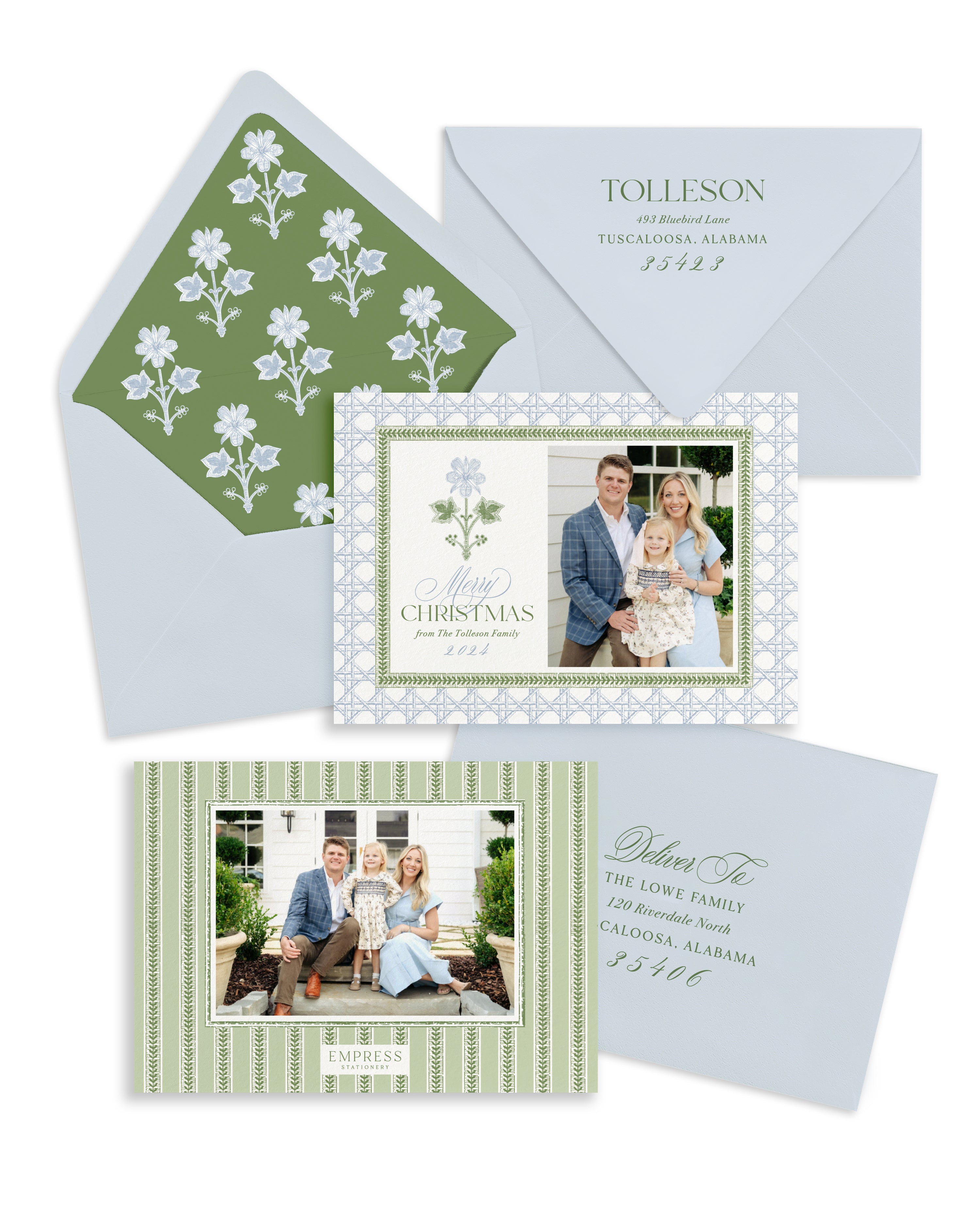 Our Christmas collab with our favorite Southern blogger is here! Meredith of The Southern Source has been a go-to for us for years when it comes to home decor, outfits for any occasion, and just overall lifestyle! Meredith loves a classic block print, shades of blue and green, and a touch of rattan. We love working together to bring you exclusive cards like this one that you simply won’t find elsewhere!