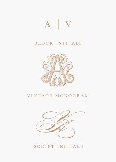 You may include a monogram or initials on any or all of your paper pieces at no additional cost. Block and script initials are designed with the fonts used within the suite, while vintage monograms are sourced from our library of double letter styles. Or, for an additional design fee, you may choose to book a custom vintage monogram with your suite.