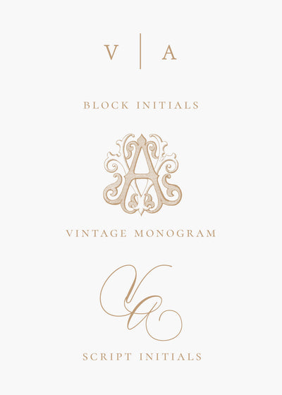 You may include a monogram or initials on any or all of your paper pieces at no additional cost. Block and script initials are designed with the fonts used within the suite, while vintage monograms are sourced from our library of double letter styles. Or, for an additional design fee, you may choose to book a custom vintage monogram with your suite.